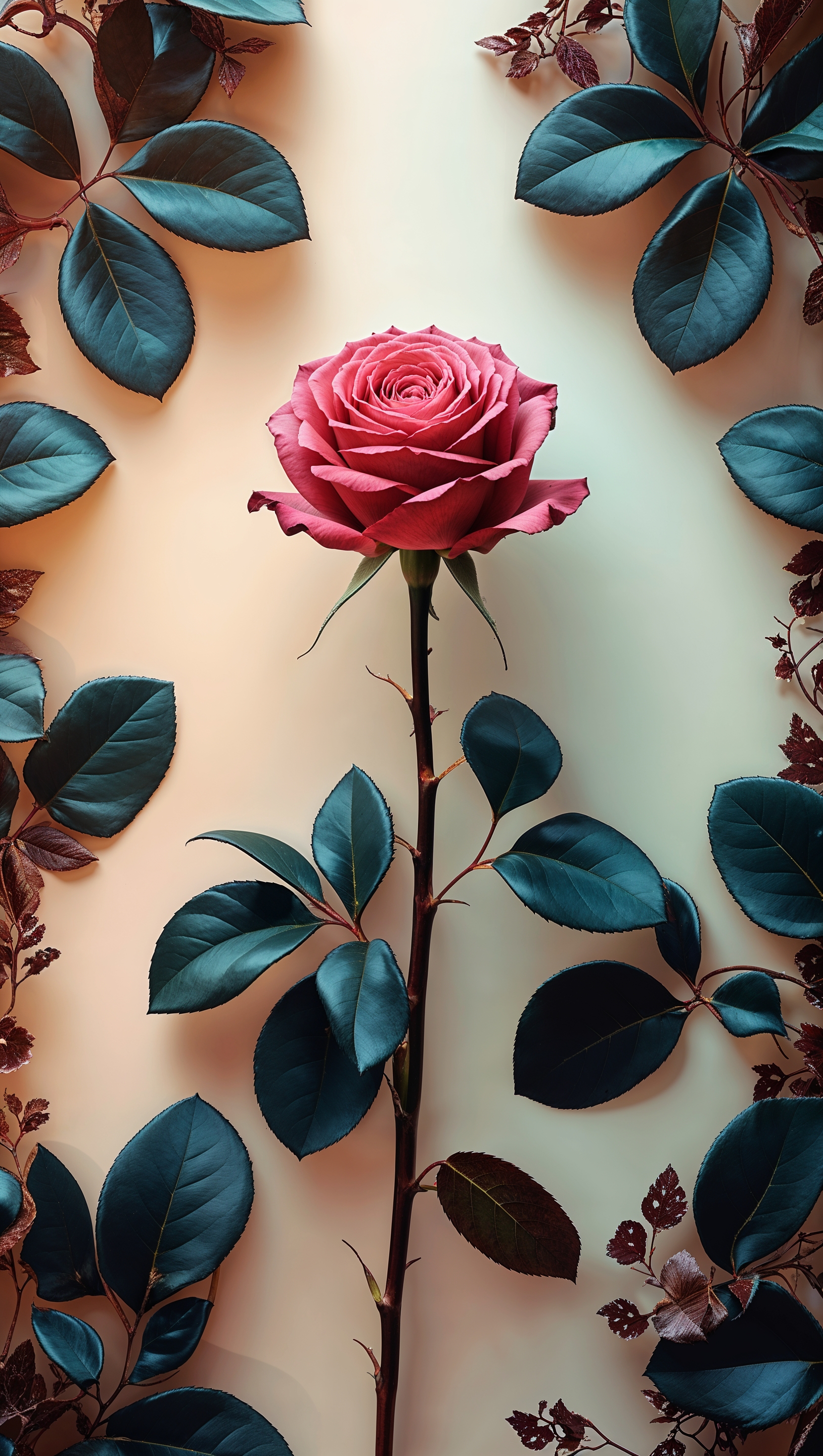 1664x2944 iPhone wallpaper with a red rose and dark green leaves