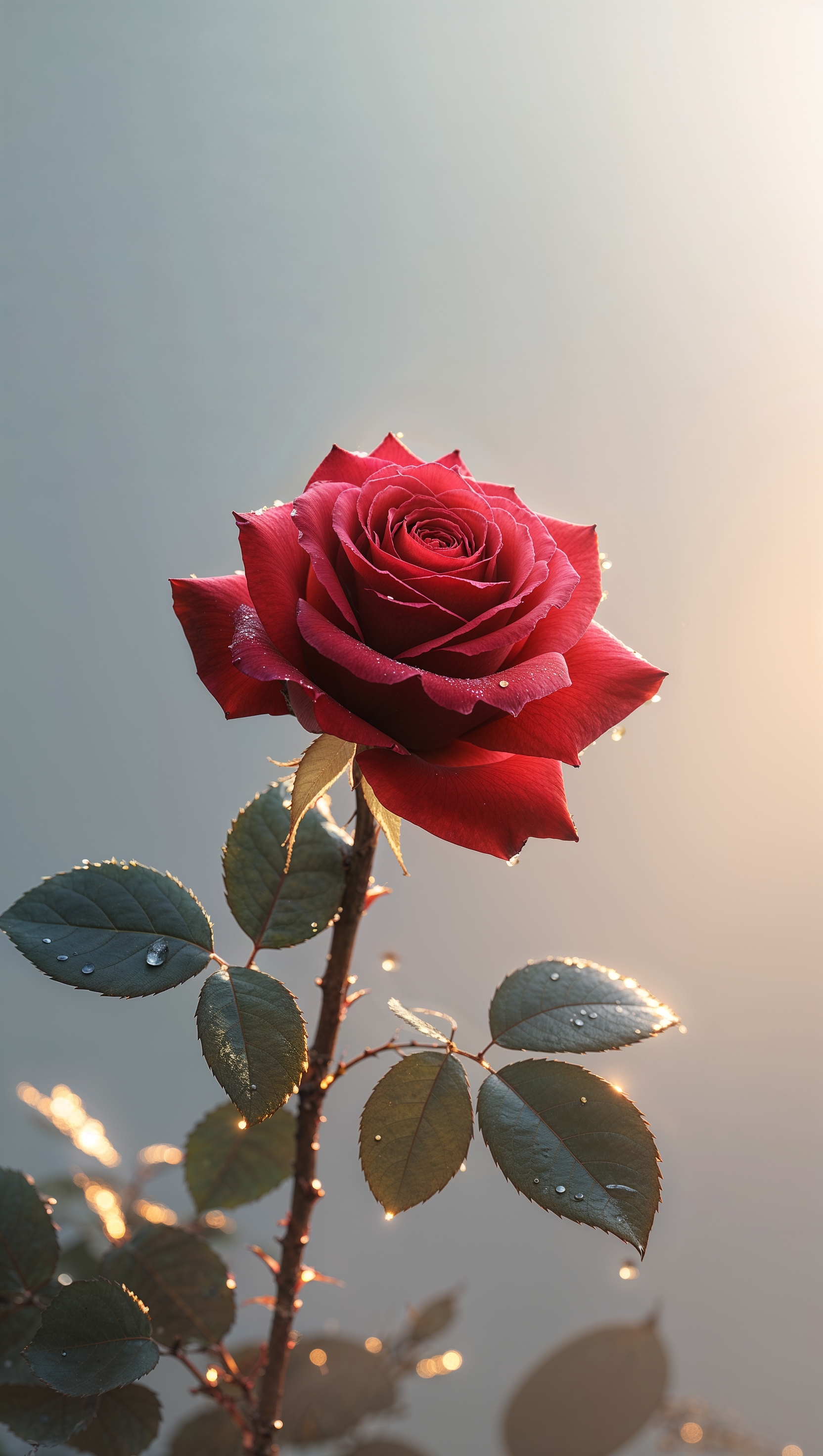 1664x2944 iPhone wallpaper with a red rose in soft morning light
