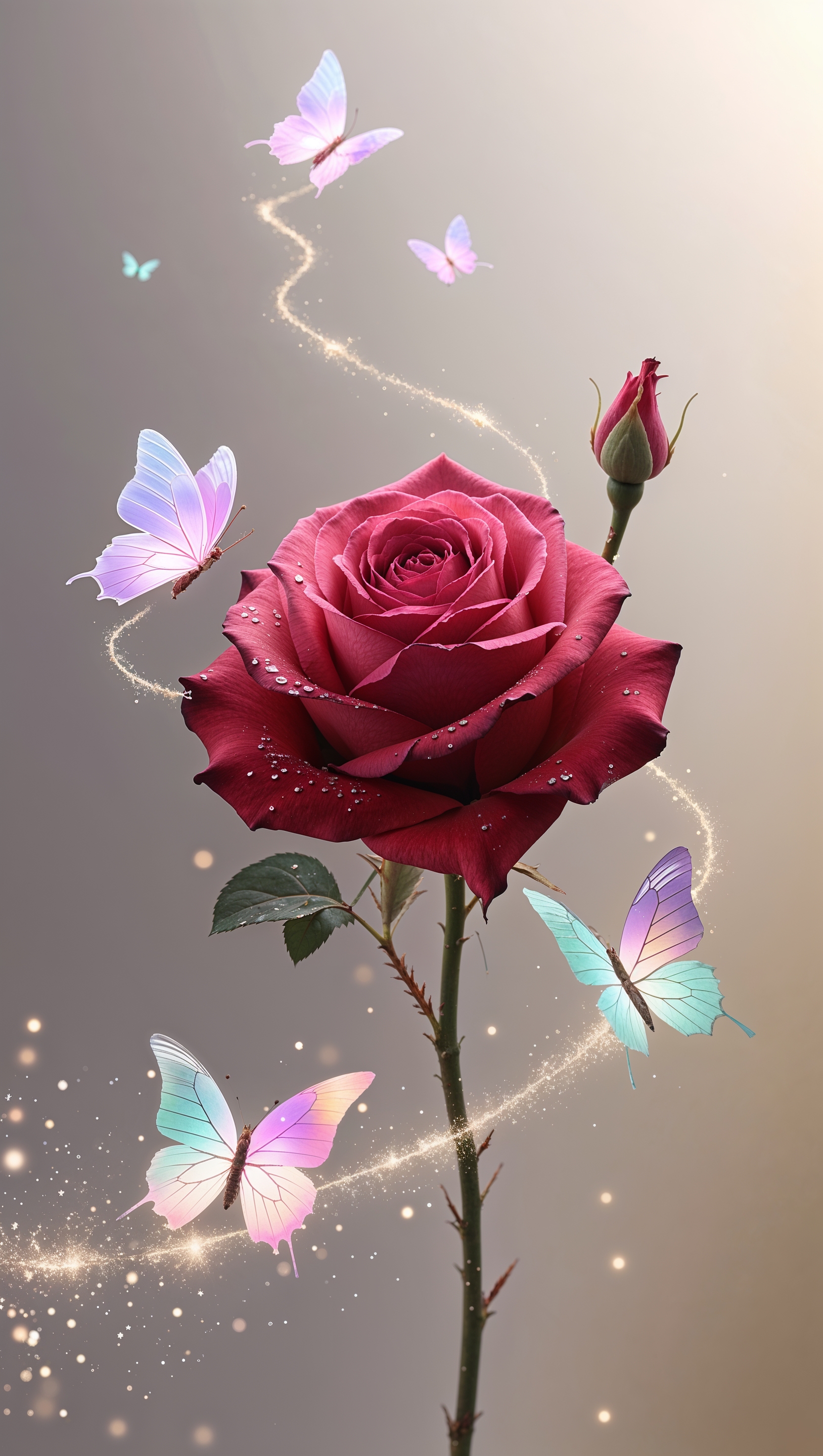 1664x2944 iPhone wallpaper with a red rose and glowing butterflies
