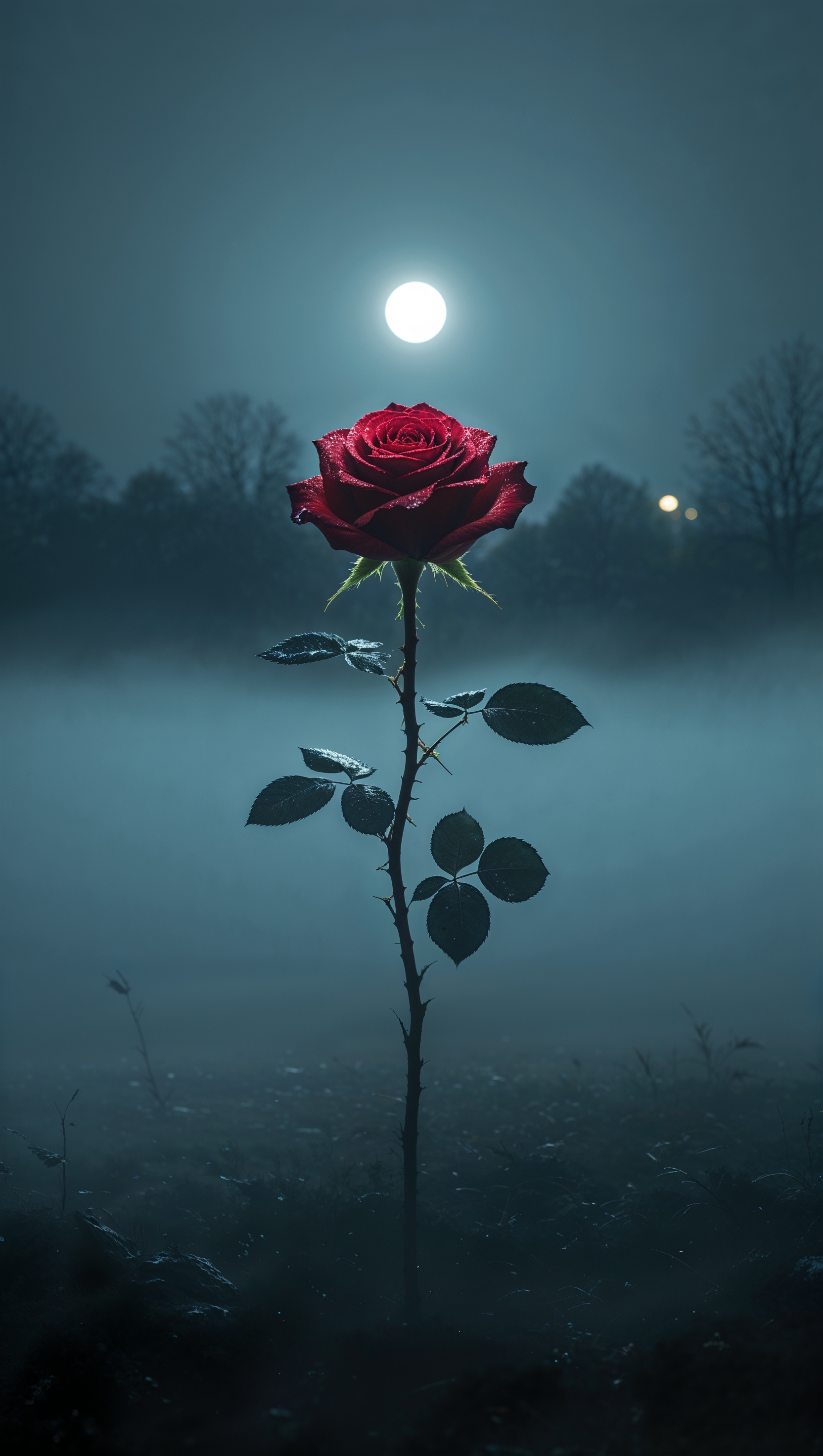 1664x2944 iPhone wallpaper with a red rose in a foggy night