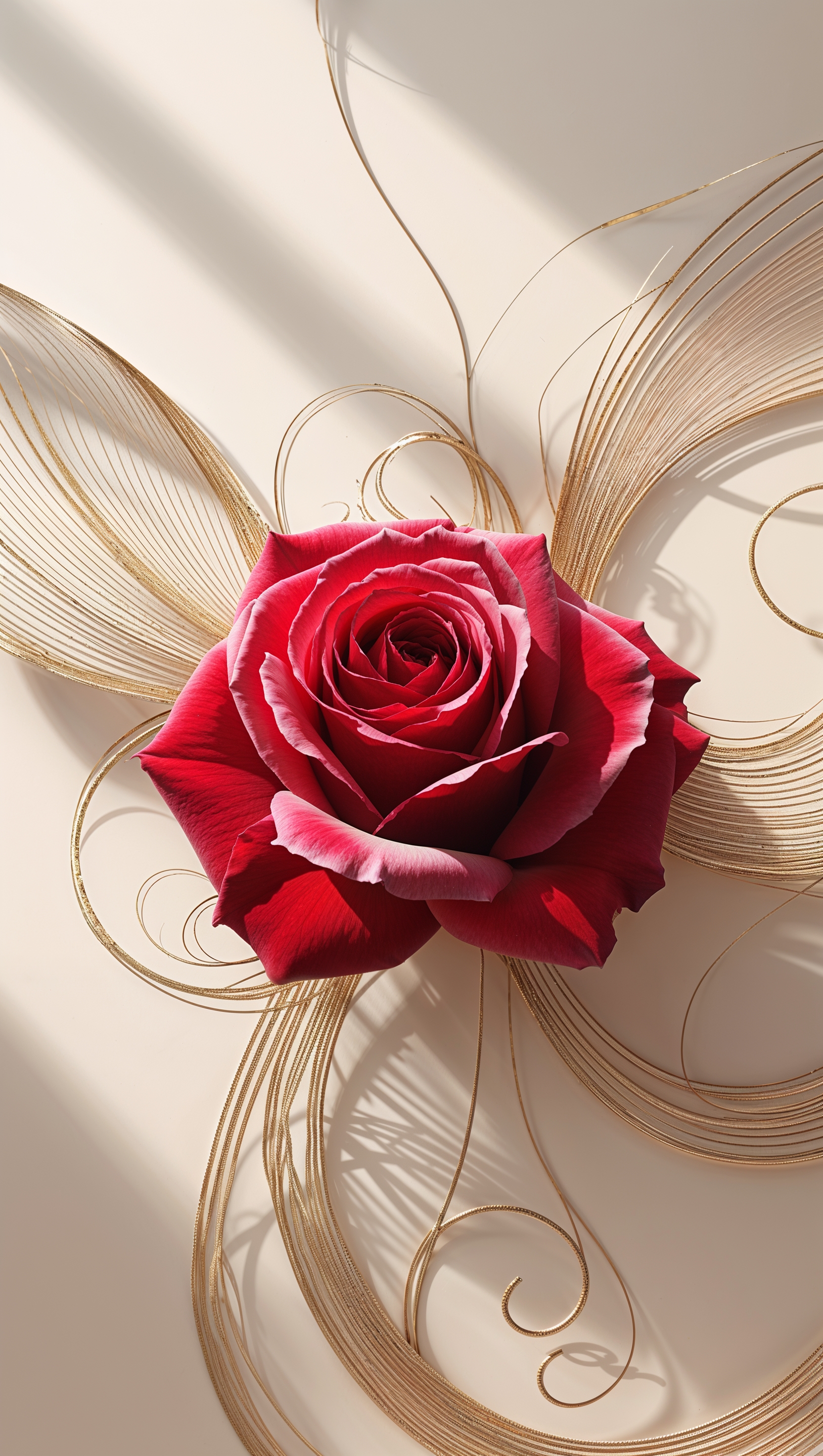 1664x2944 iPhone wallpaper with a red rose and delicate golden lines