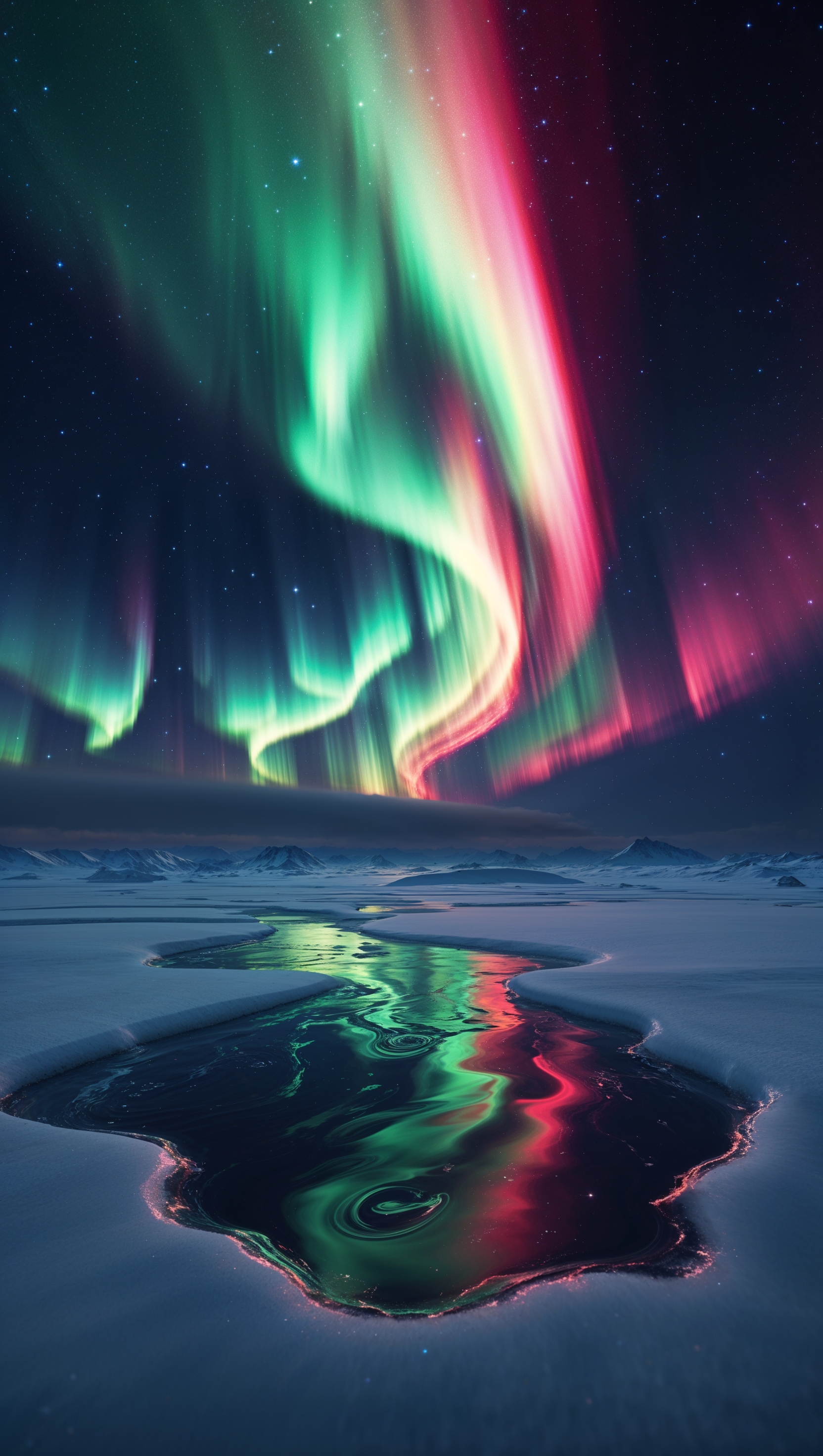 1664x2944 Aurora lights in space, reflected on an icy surface, ultra-high quality for iPhone