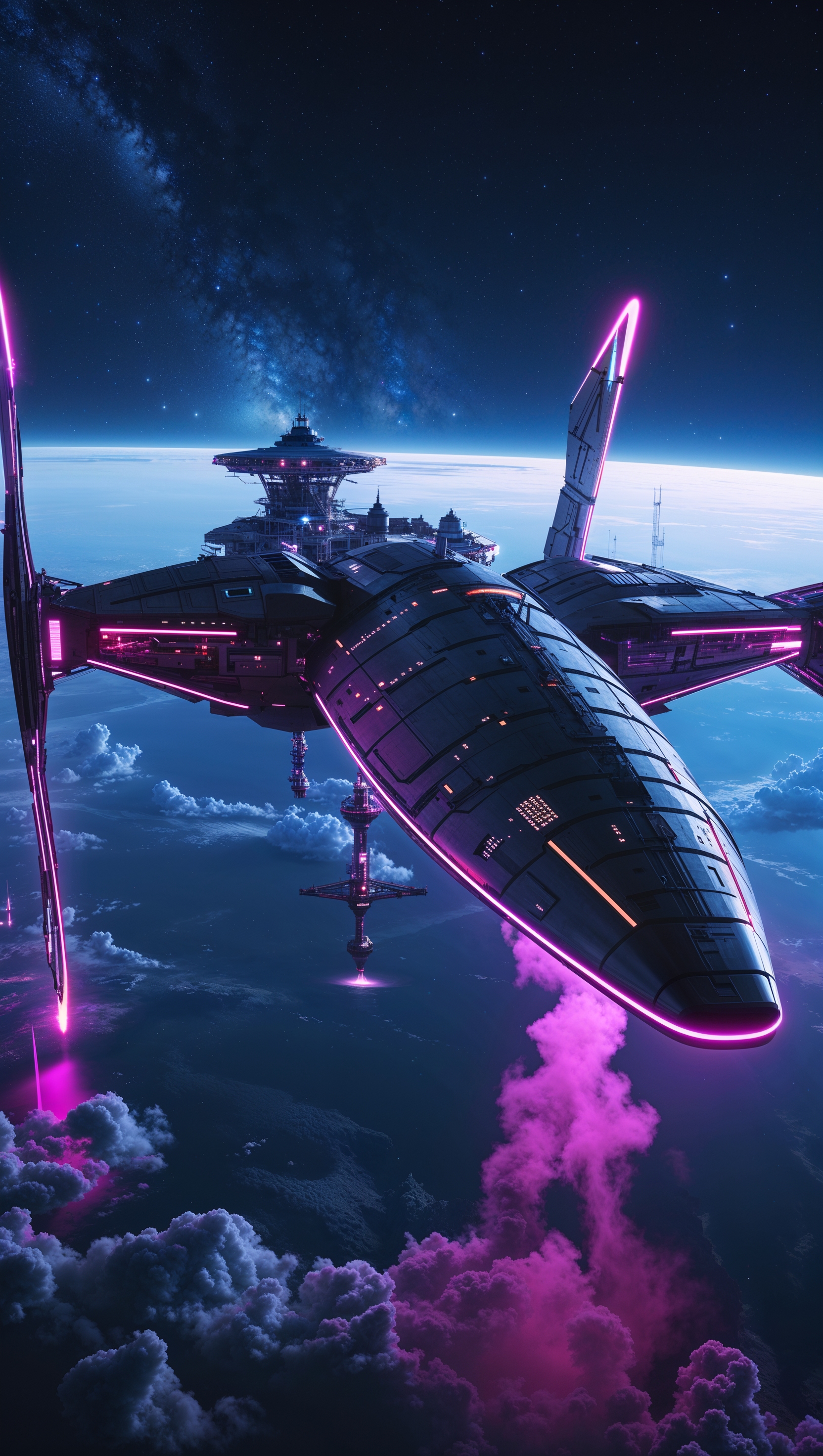1664x2944 Floating space station above Earth, neon lights, realistic style, for iPhone, 4K