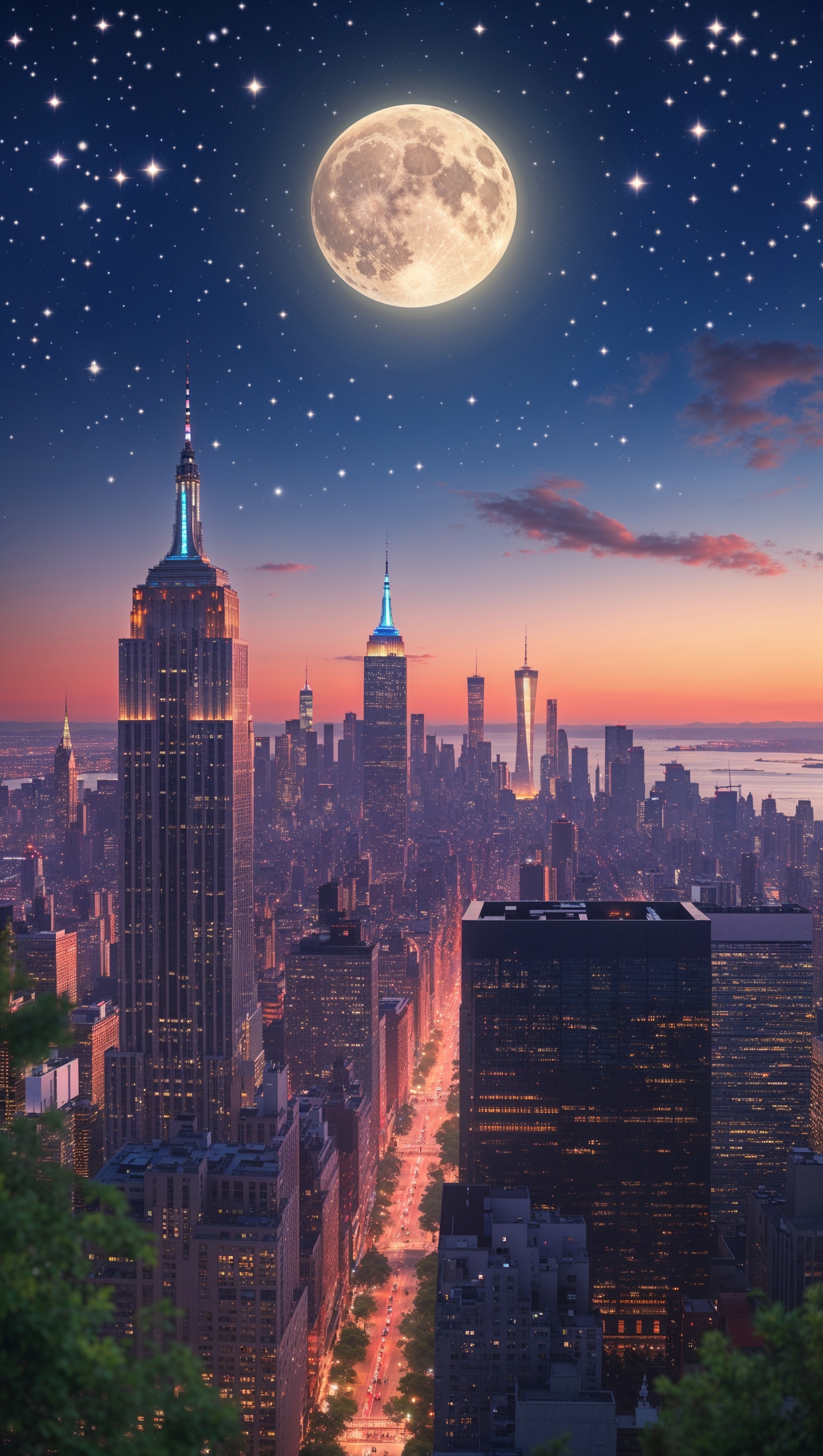 1664x2944 New York skyline with stars and moon, dreamy night vibe