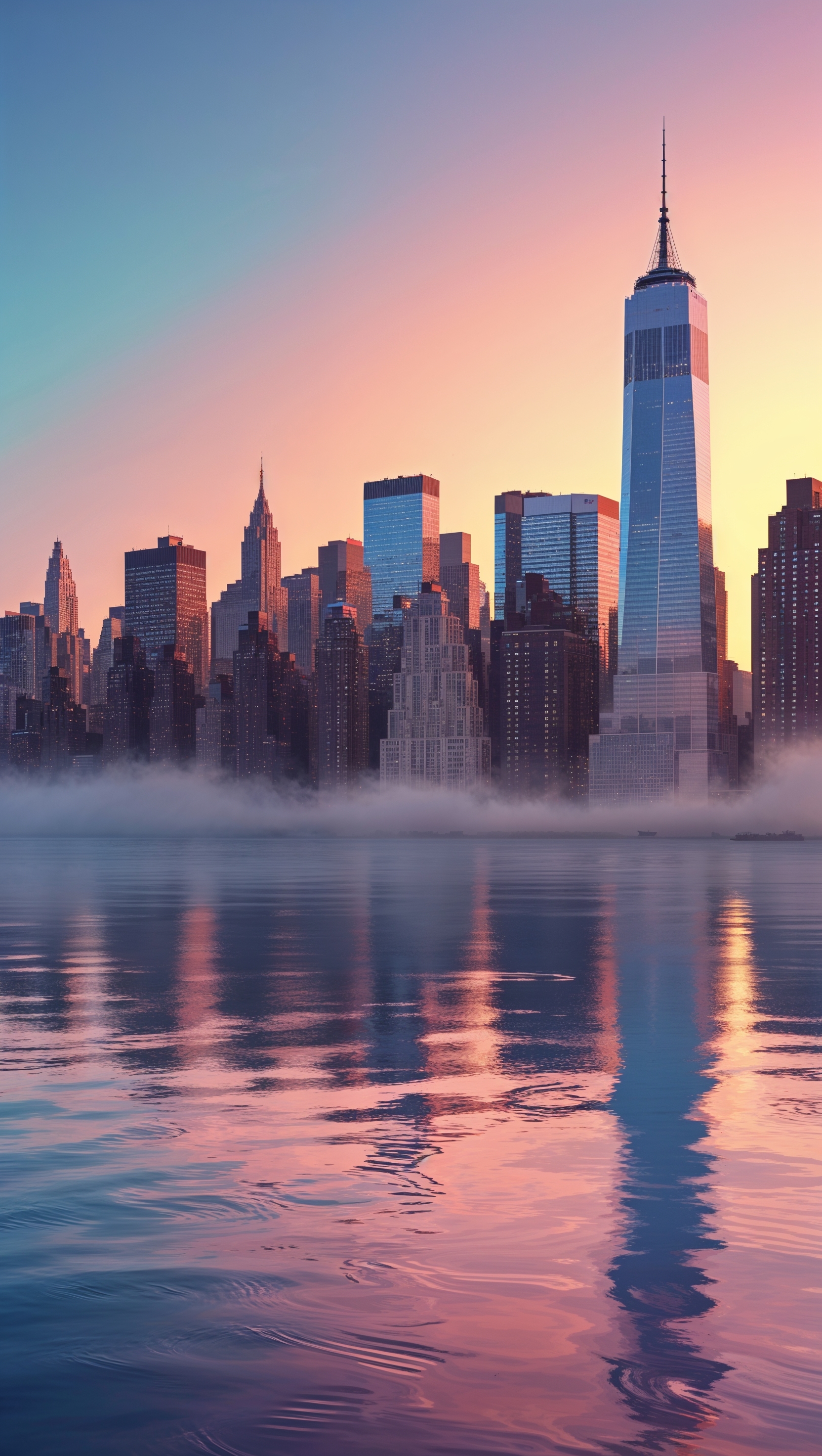 1664x2944 Manhattan skyline reflected in water at dusk, cinematic look