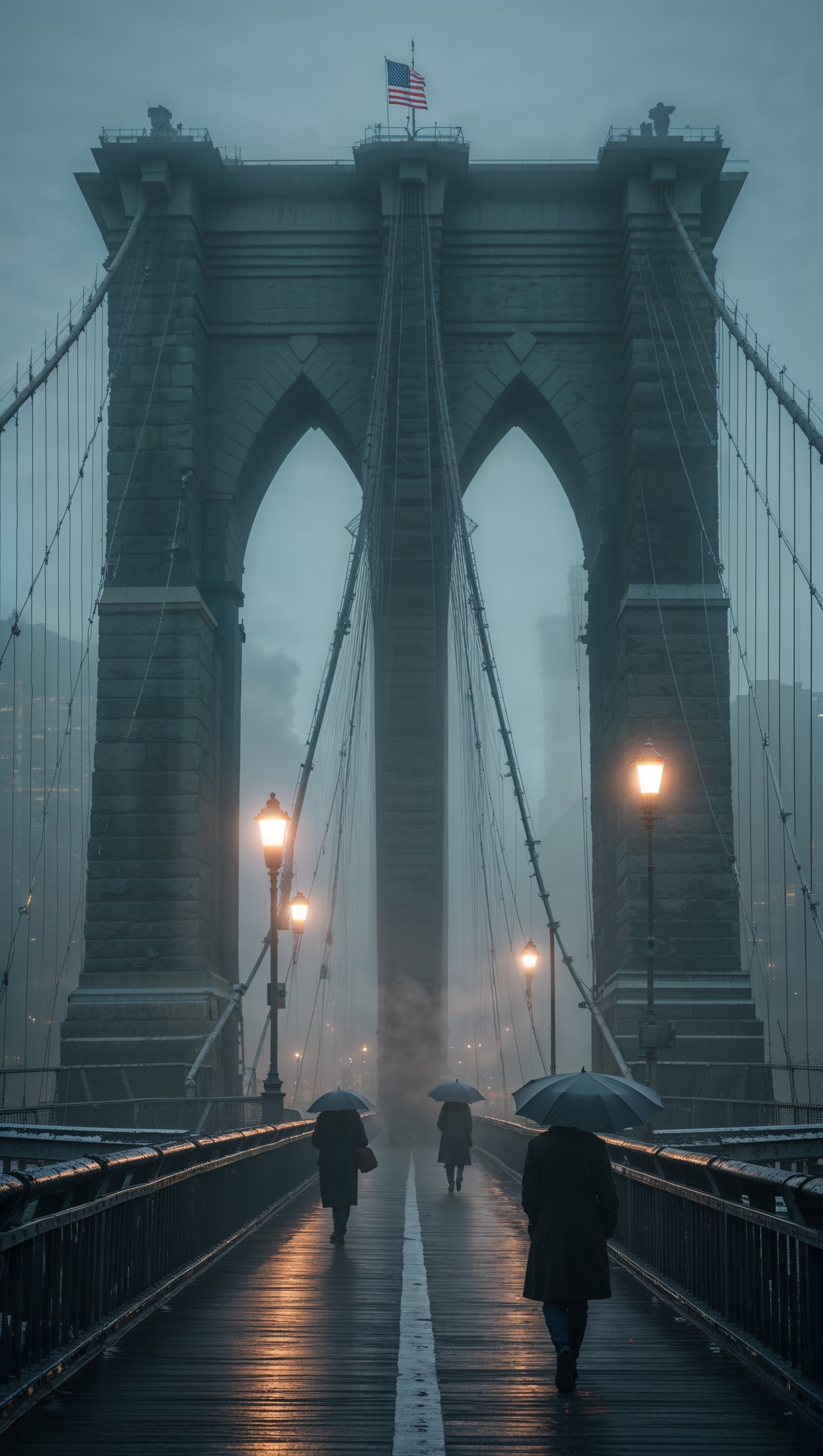 1664x2944 Foggy morning on the Brooklyn Bridge, moody atmosphere