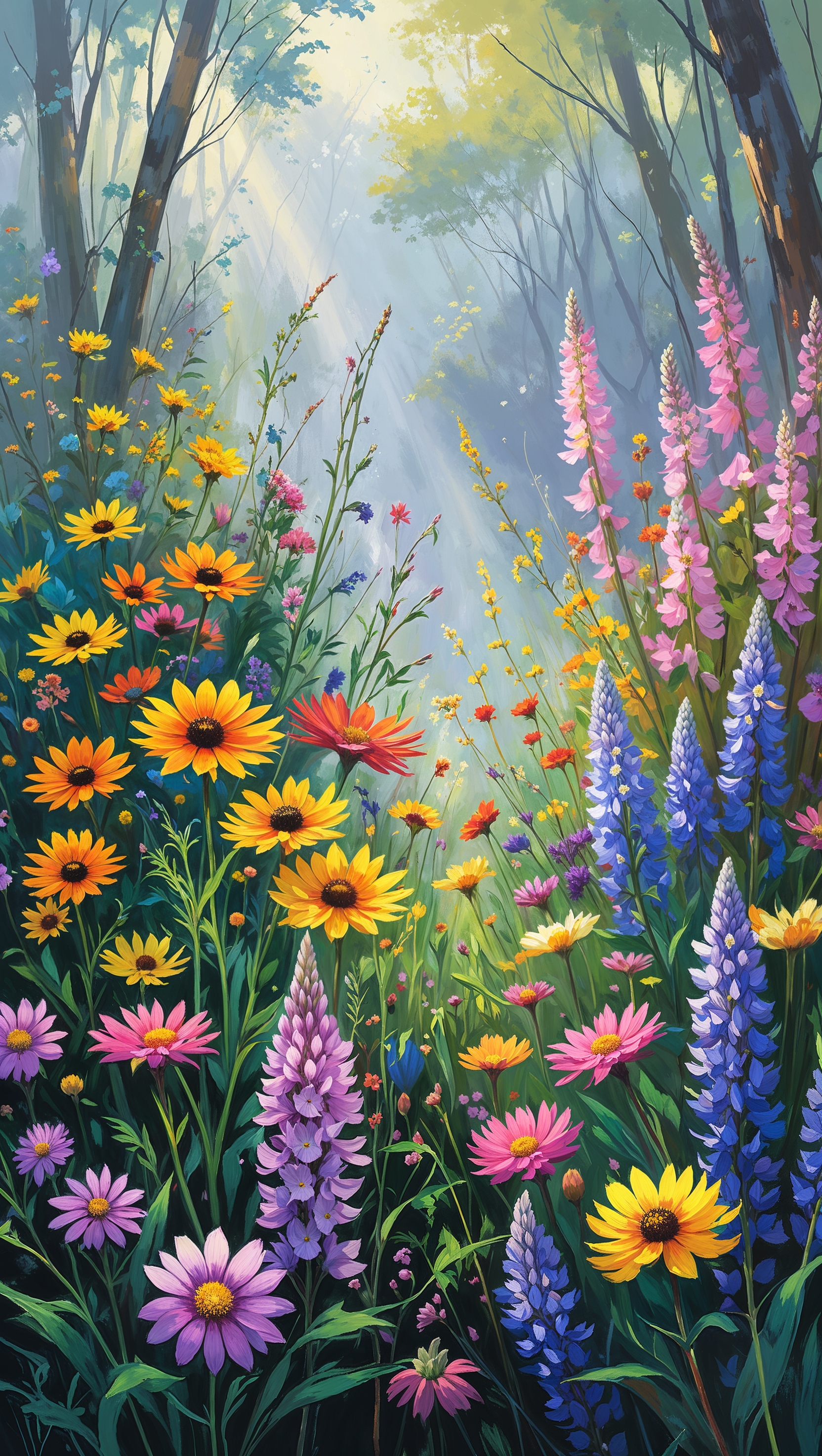 1664x2944 Digital painting of wildflowers in a forest, iPhone wallpaper