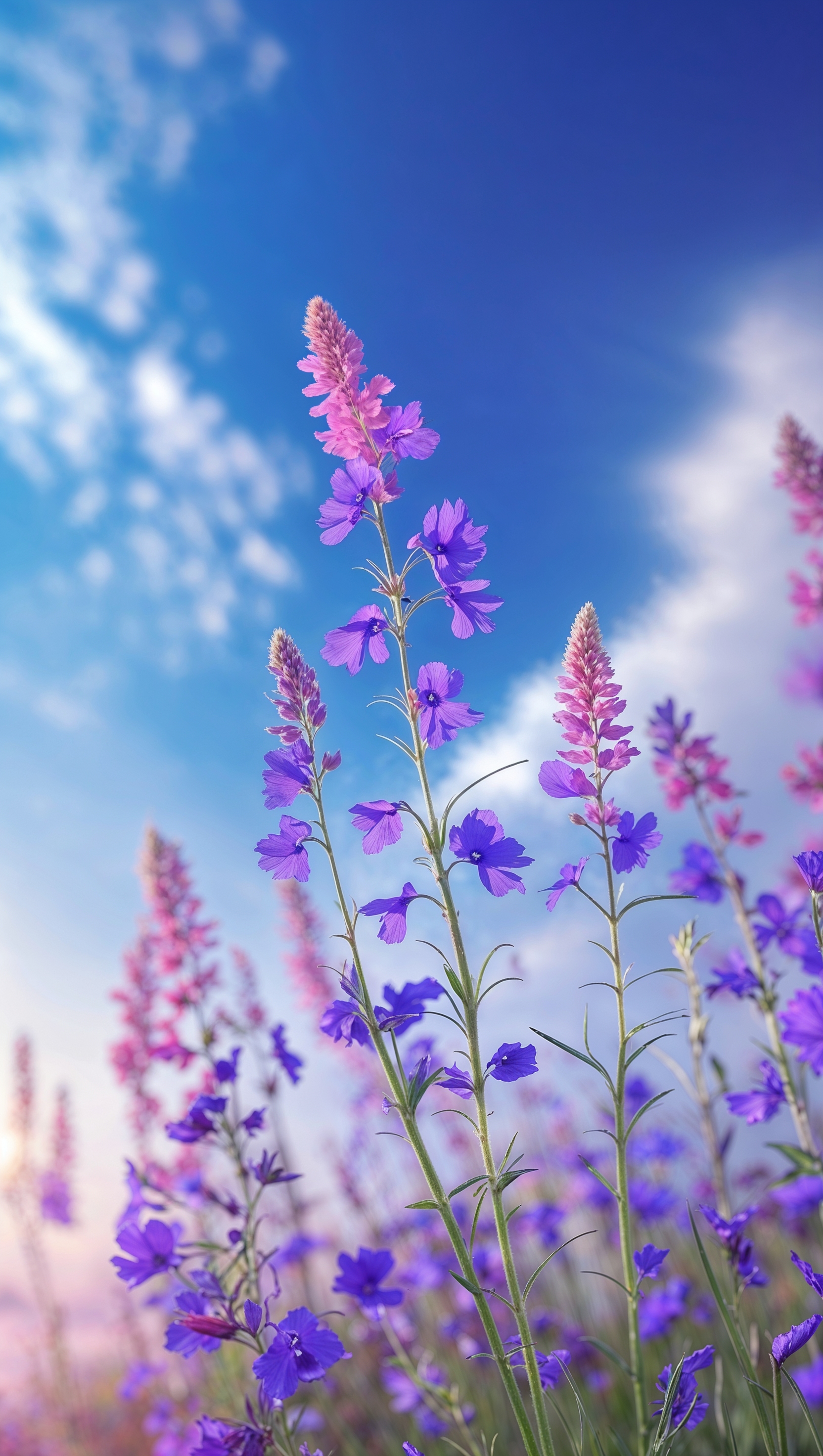 1664x2944 Purple and pink wildflowers with blue sky, iPhone wallpaper