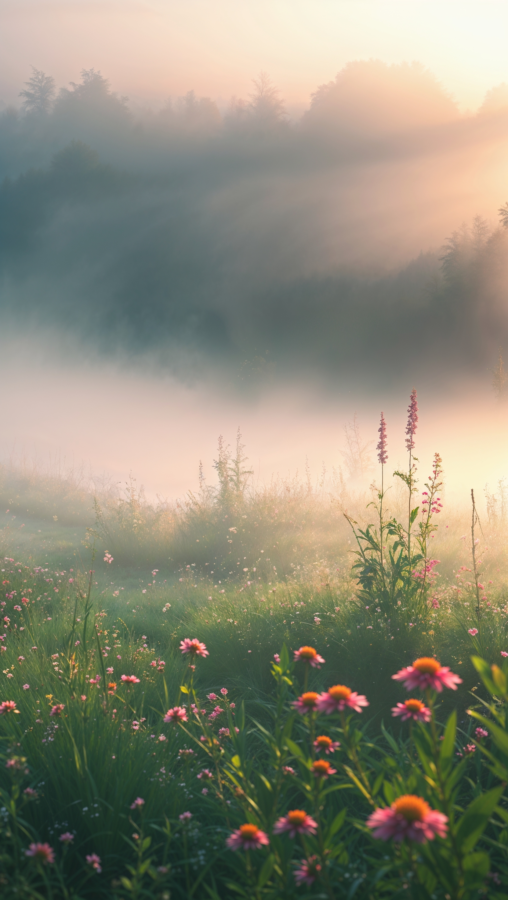1664x2944 Wildflowers in morning mist, perfect for iPhone wallpaper