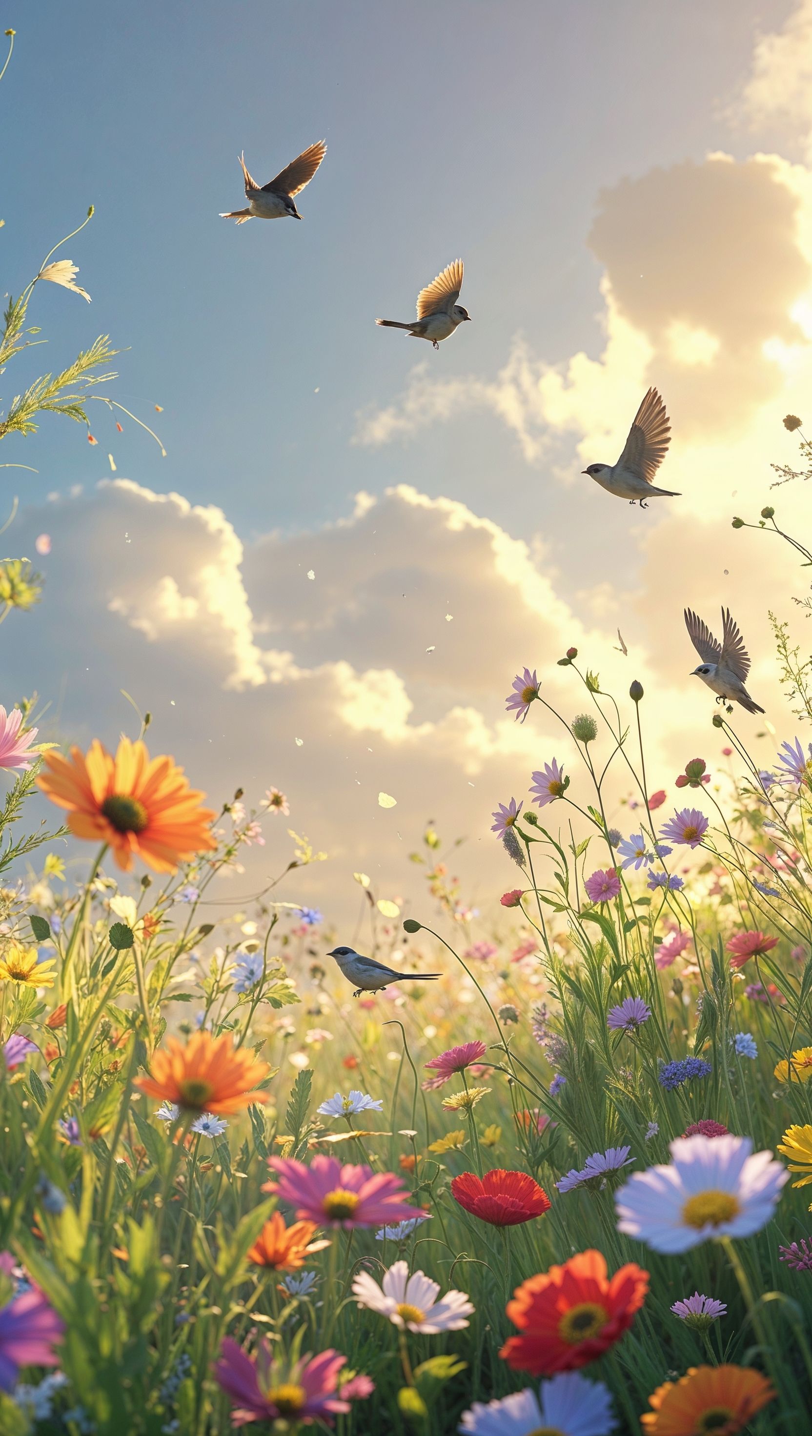 1664x2944 Wildflowers and small birds, iPhone wallpaper