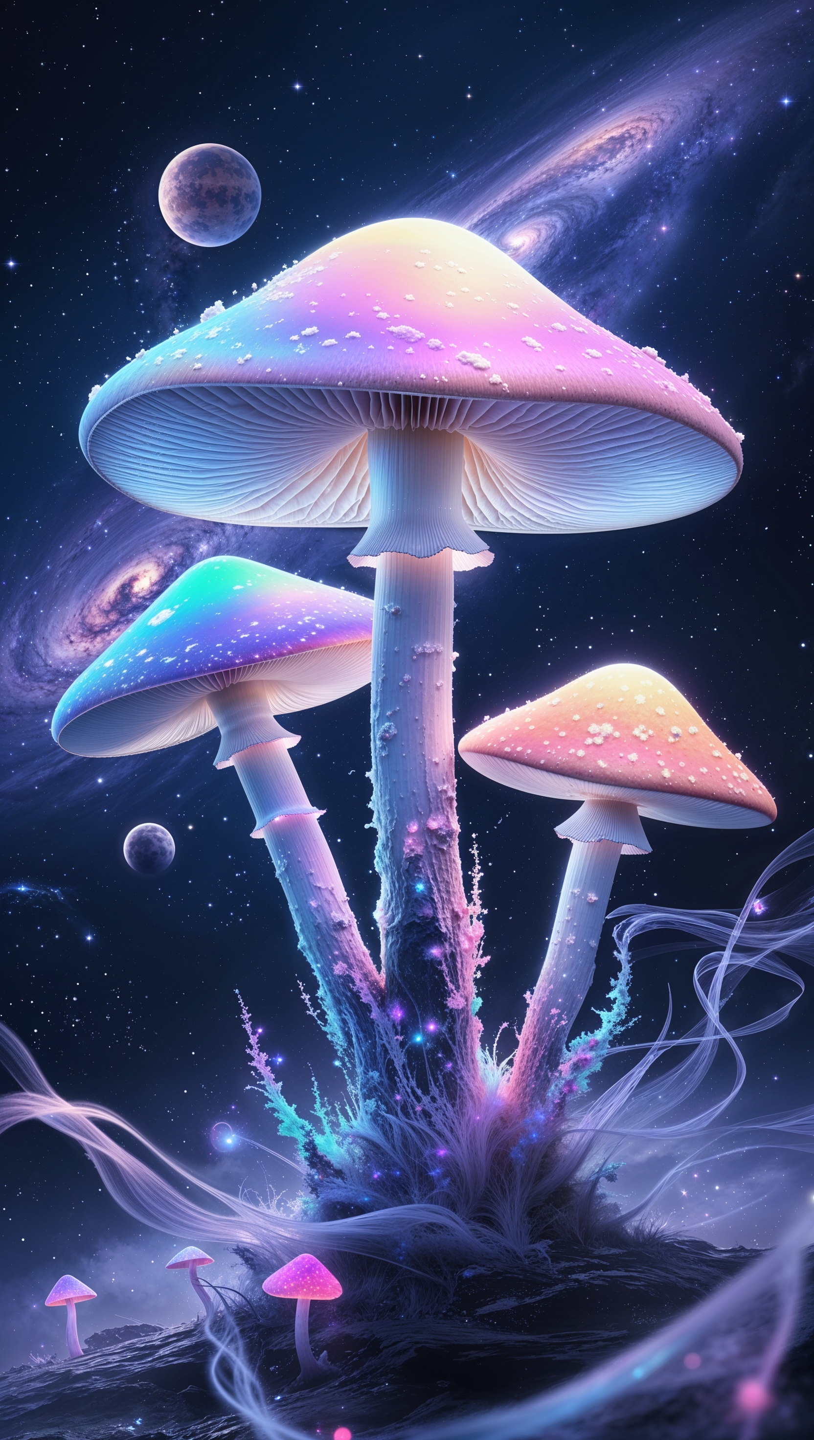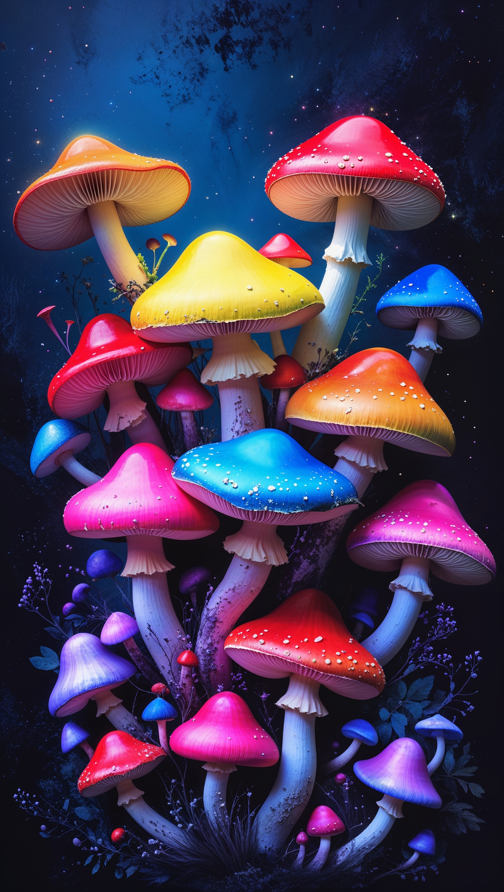 1664x2944 iPhone wallpaper with rainbow-colored mushrooms and chiaroscuro