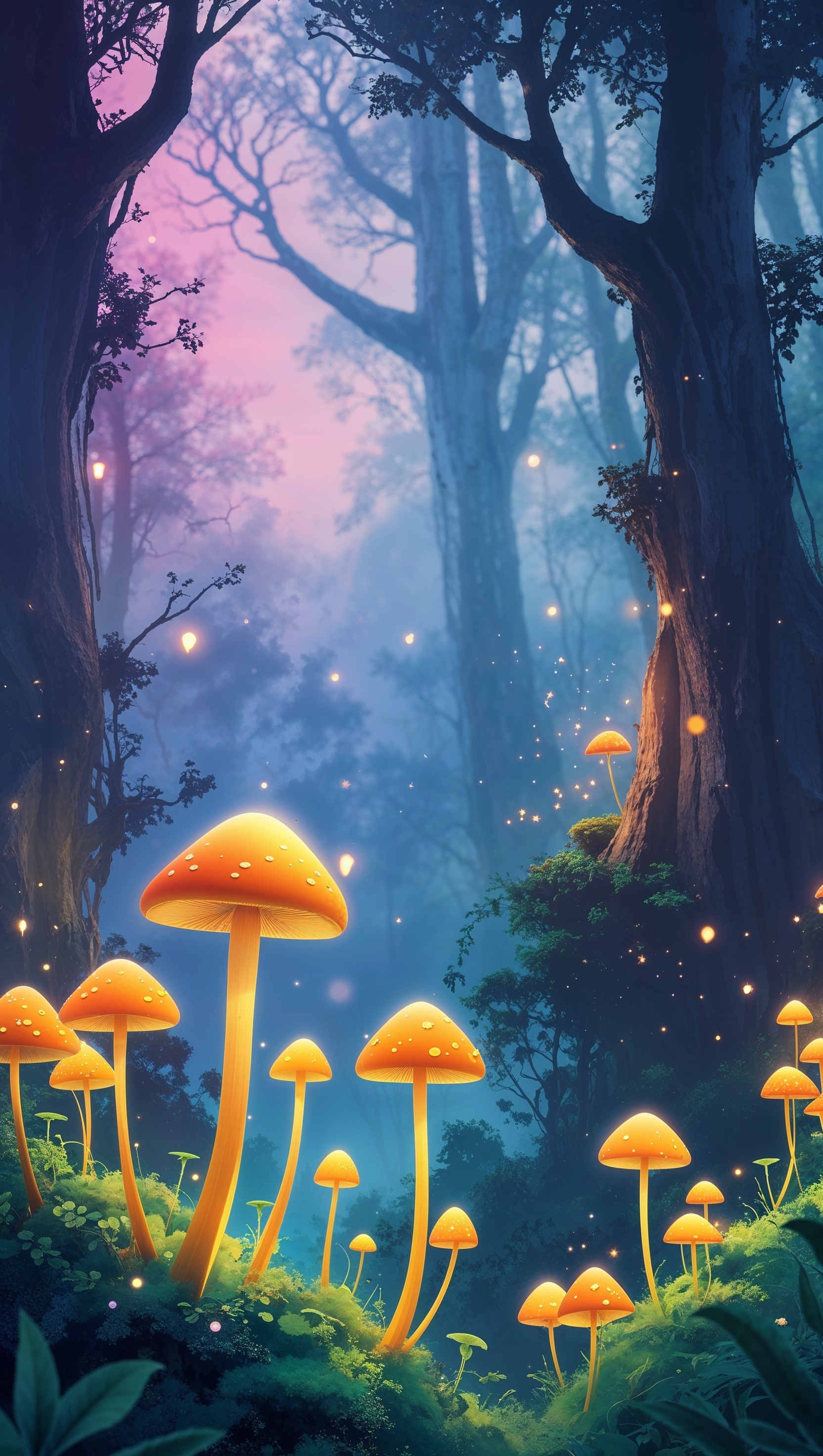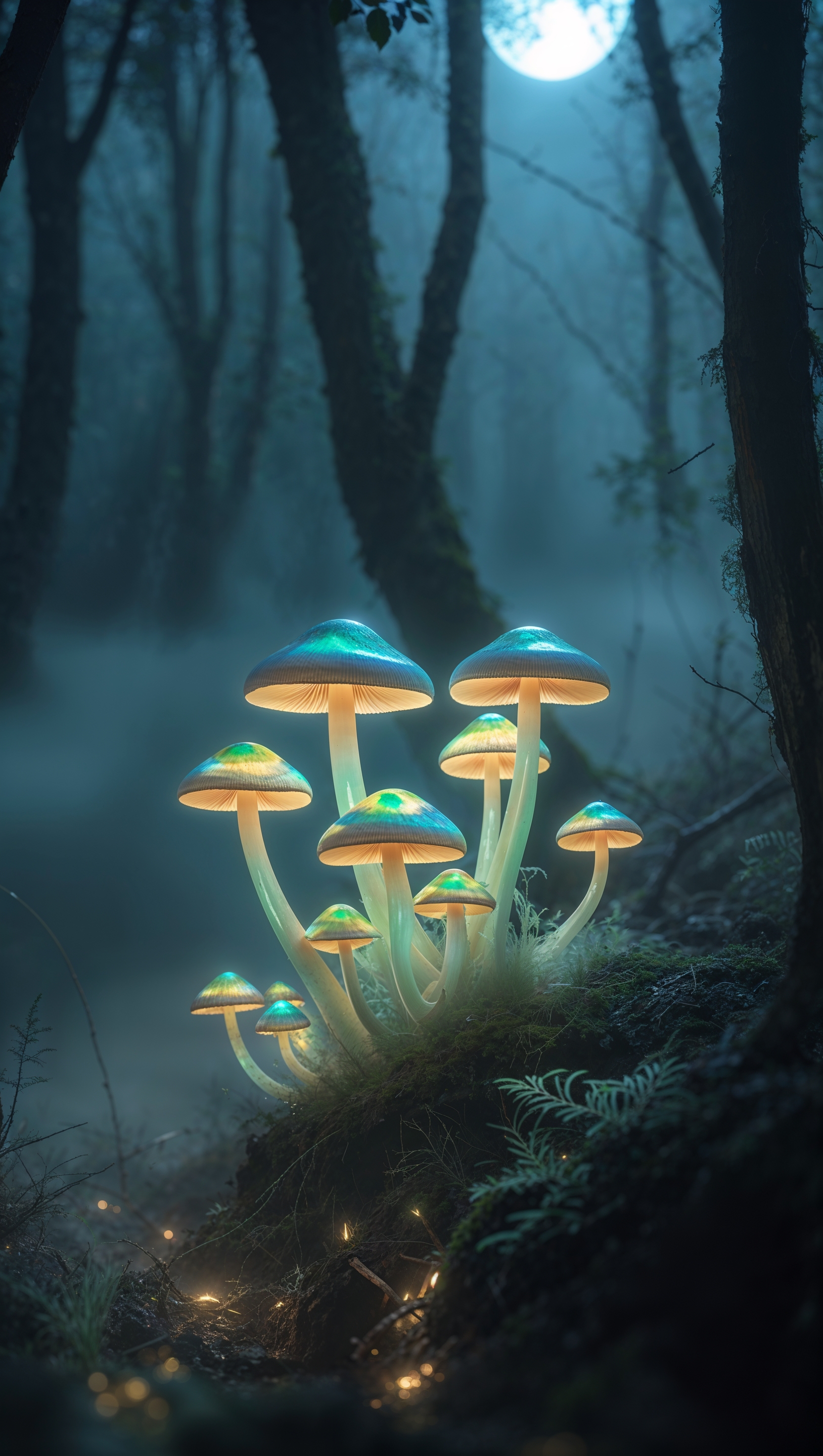 1664x2944 iPhone wallpaper with glowing mushrooms and night light effect