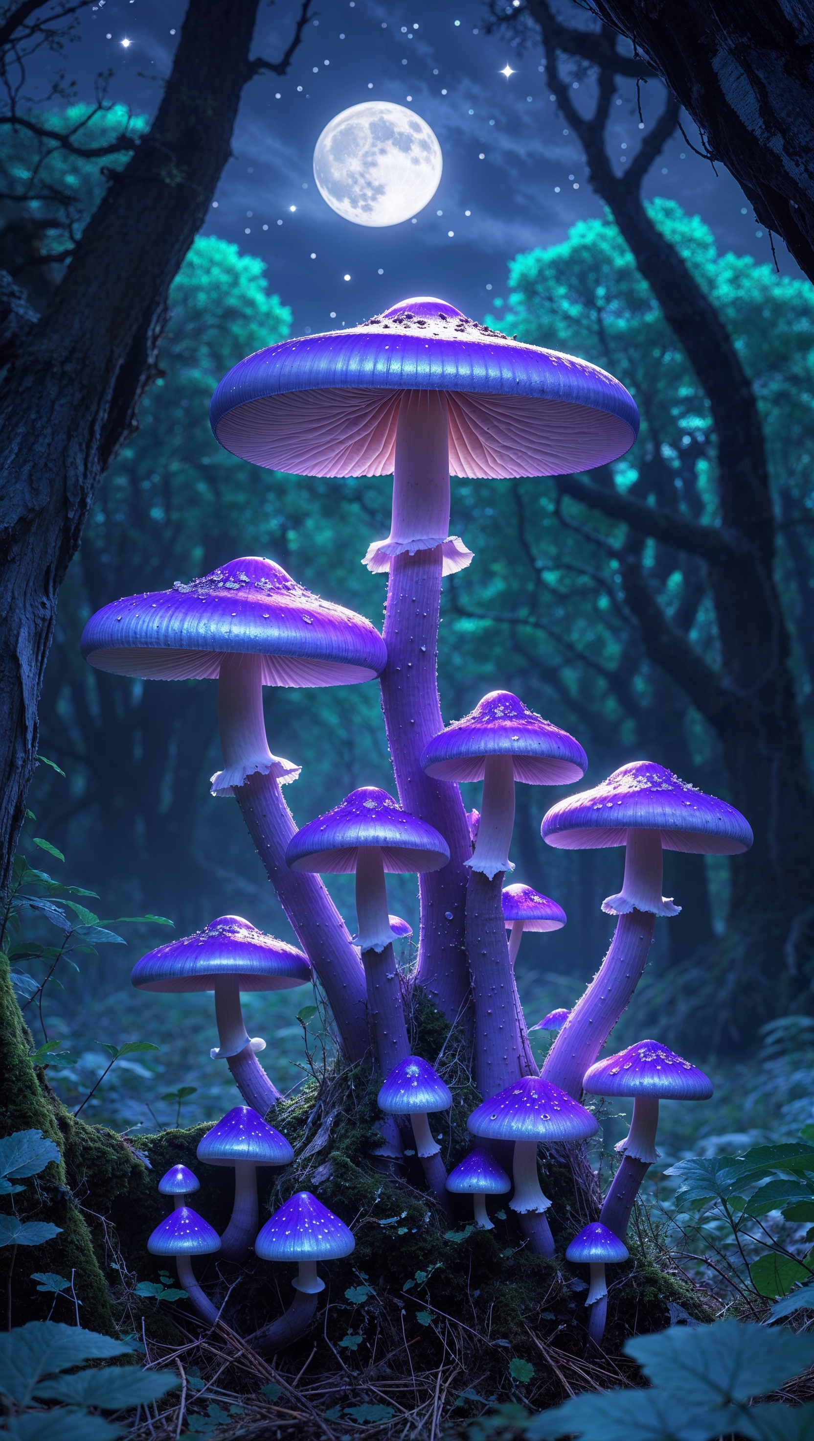 1664x2944 iPhone wallpaper with purple mushrooms in a night forest
