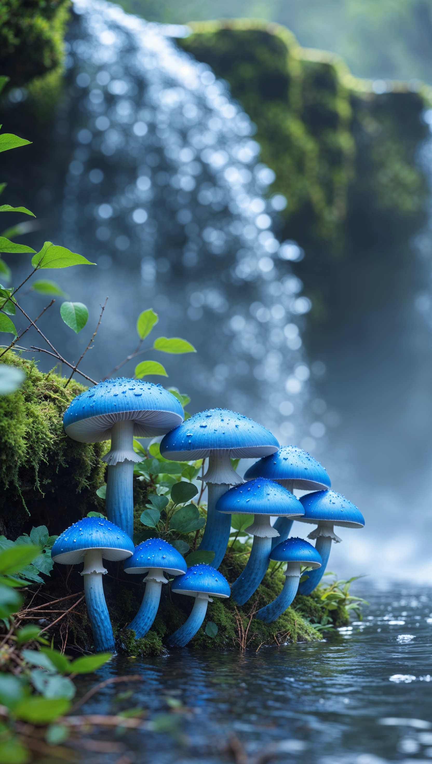 1664x2944 iPhone wallpaper with blue mushrooms near a waterfall