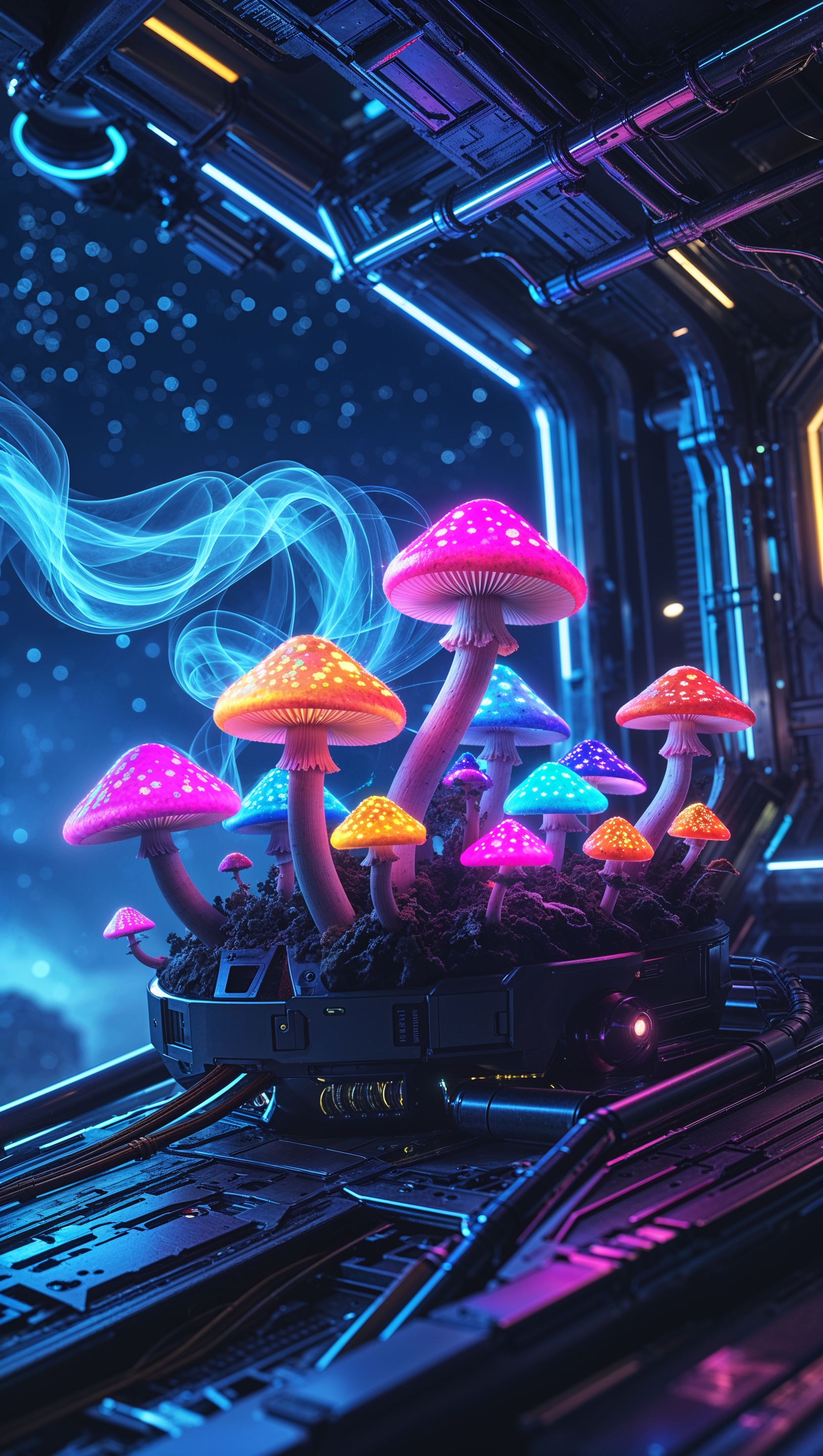 1664x2944 iPhone wallpaper with neon mushrooms in cyberpunk space