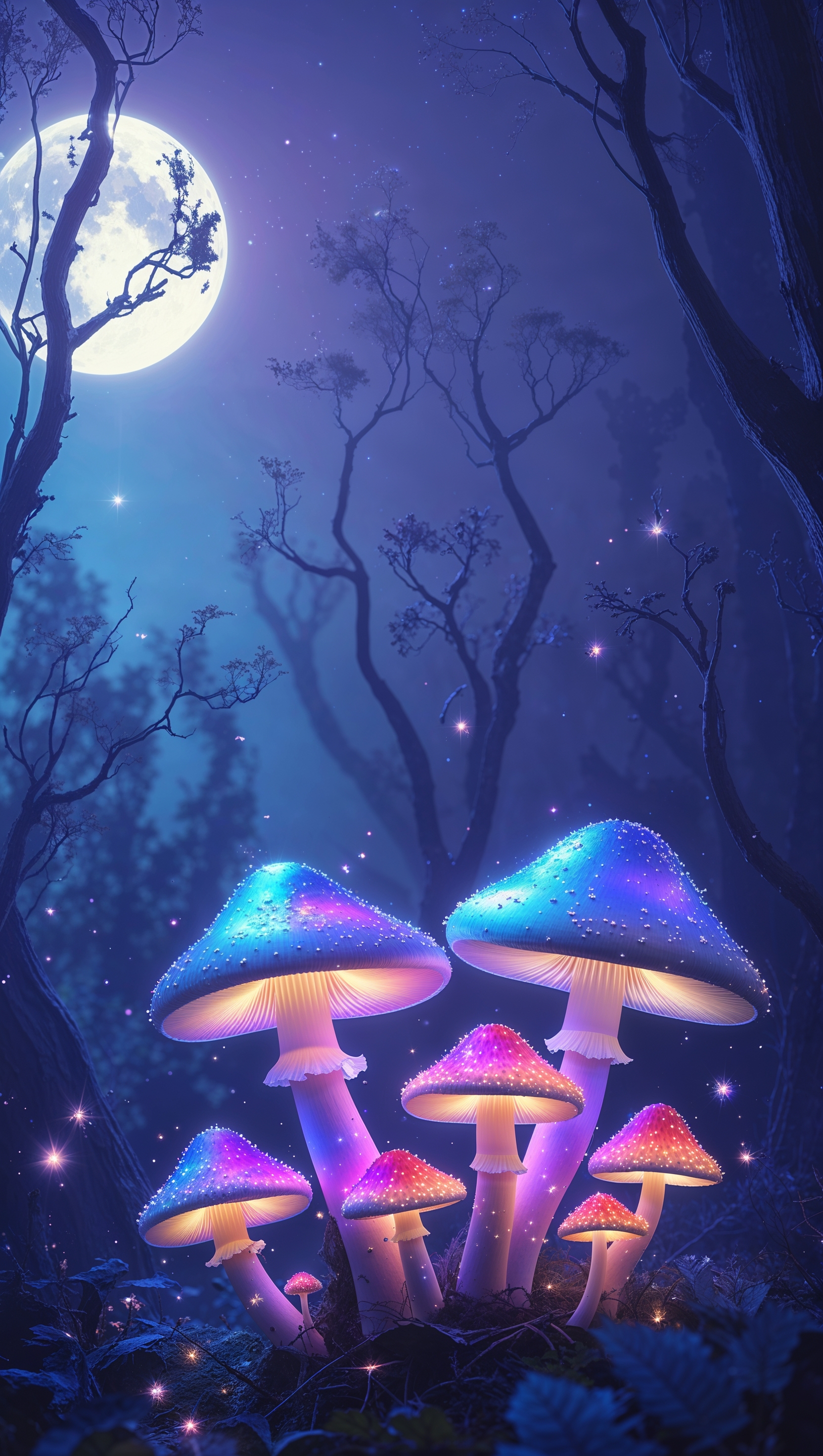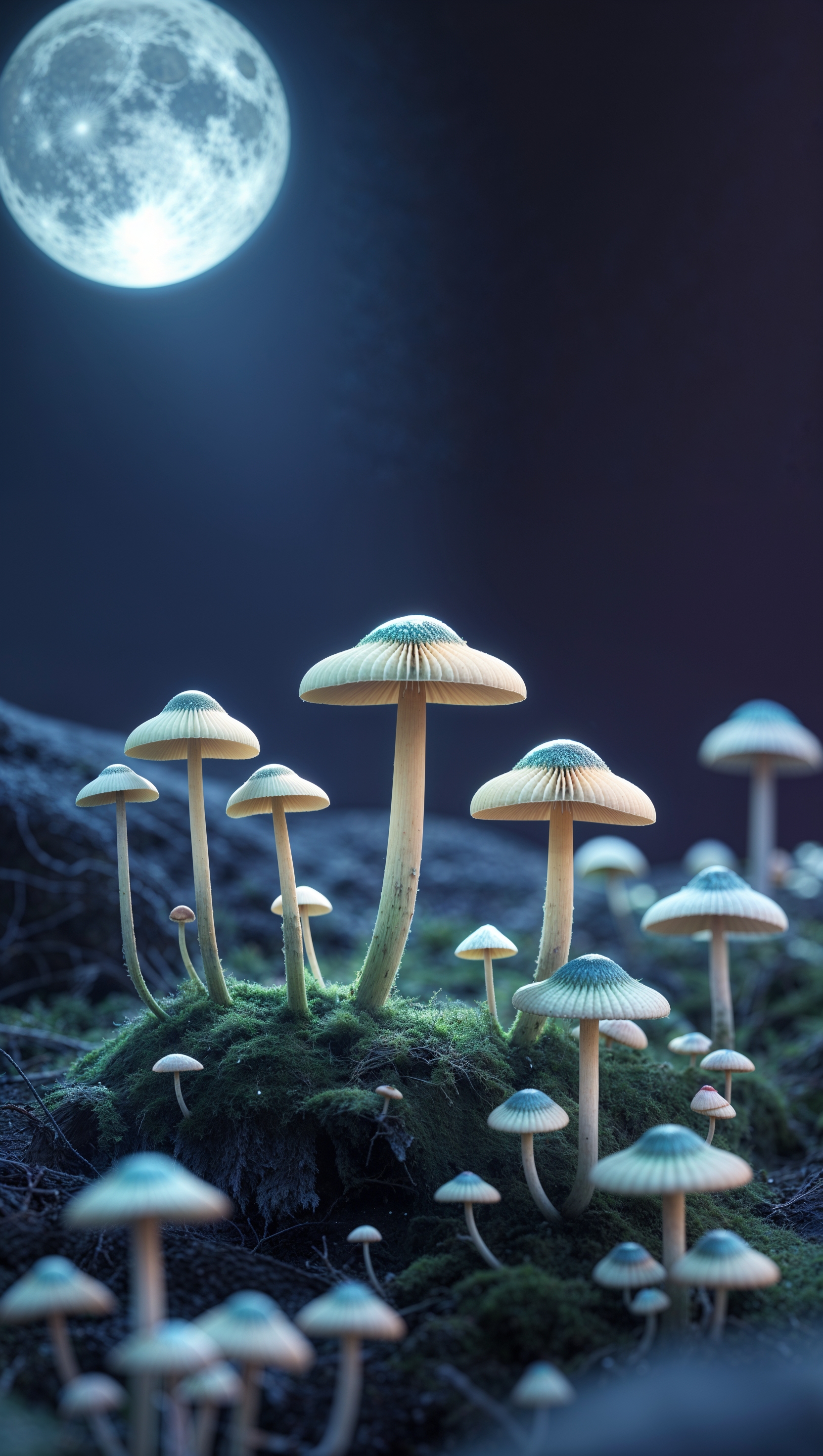 1664x2944 iPhone wallpaper with tiny mushrooms under moonlight