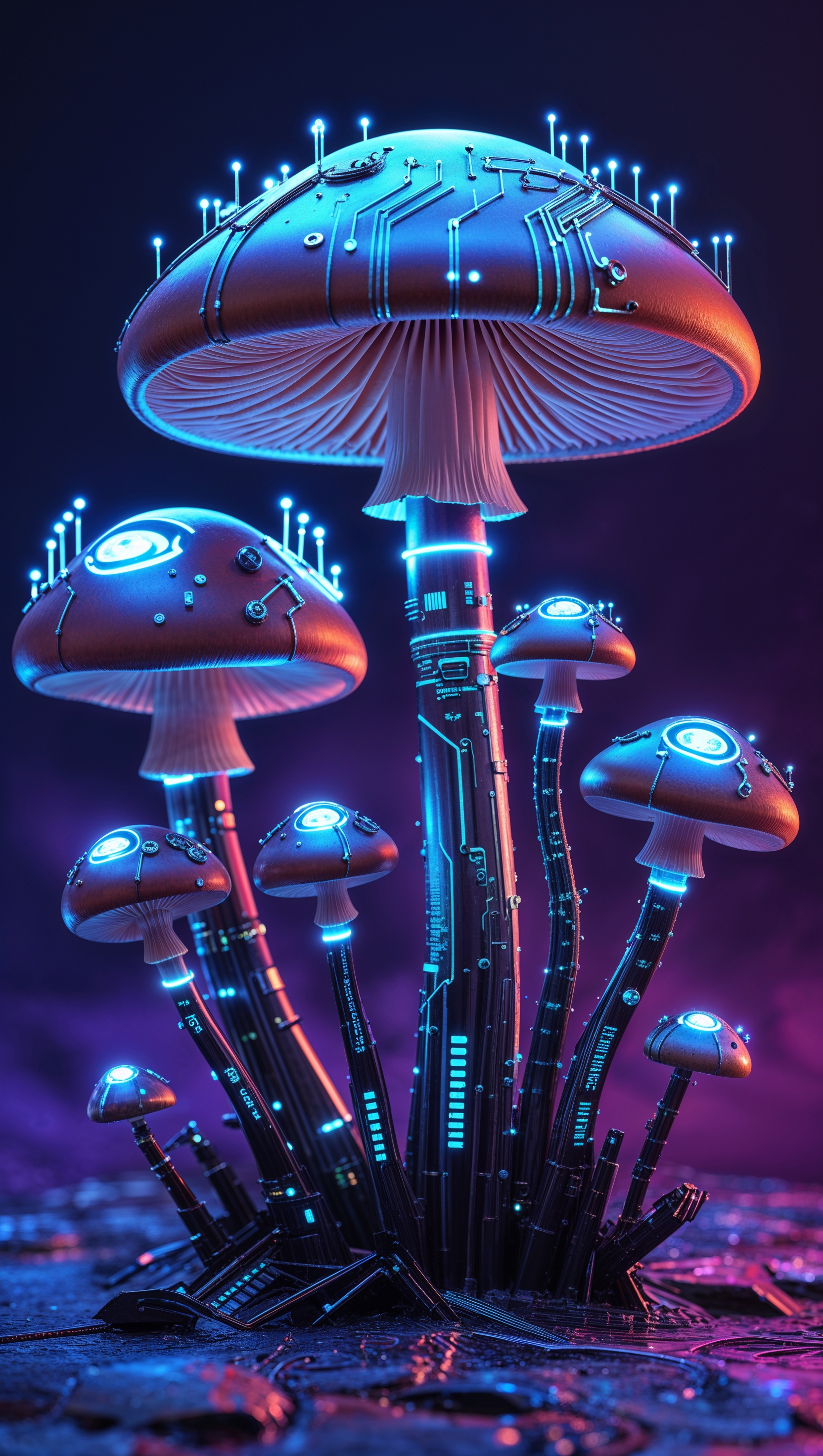 1664x2944 iPhone wallpaper with robotic and cybernetic mushrooms