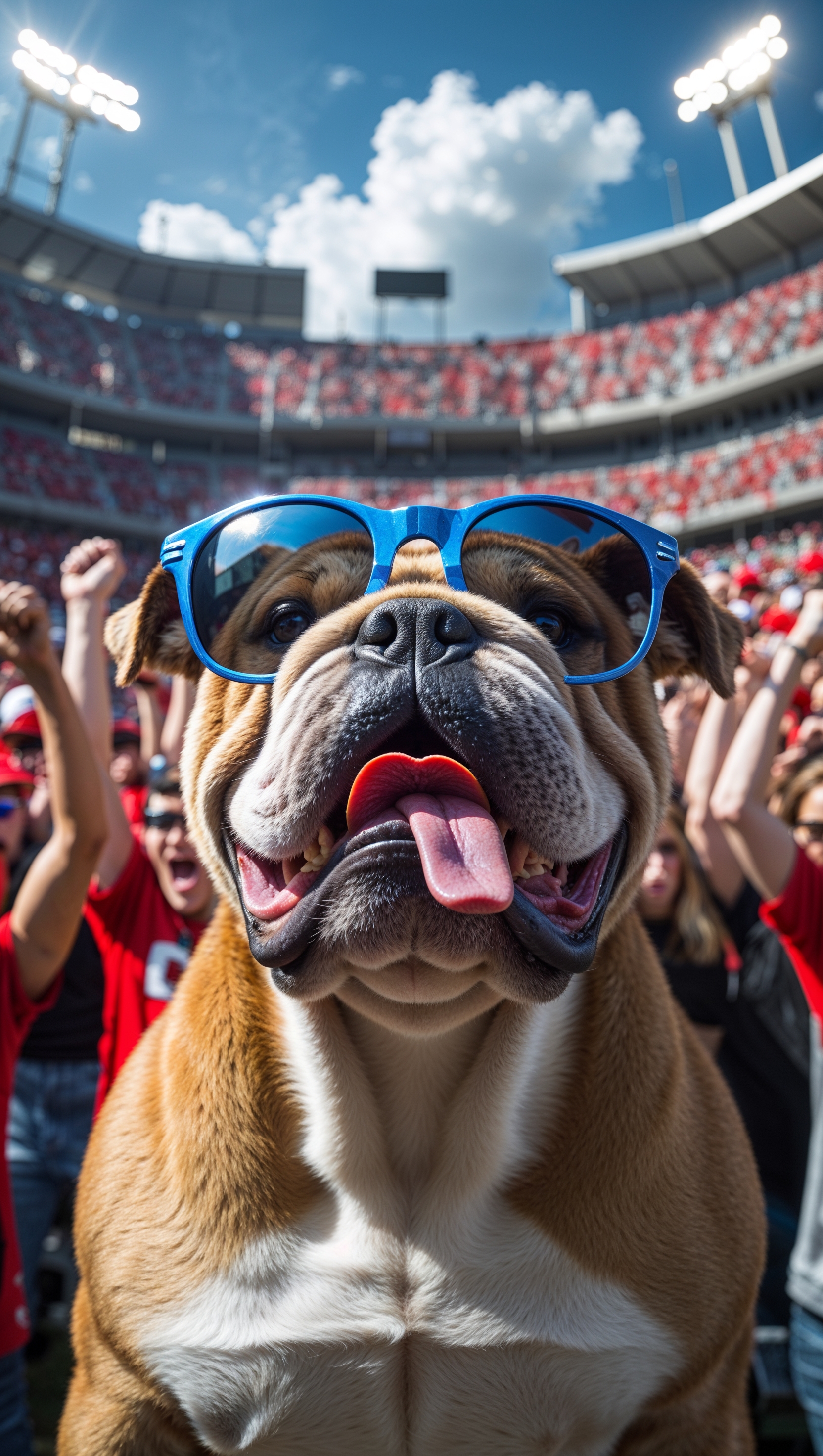 1664x2944 Georgia Bulldog wearing sunglasses in a crowded stadium