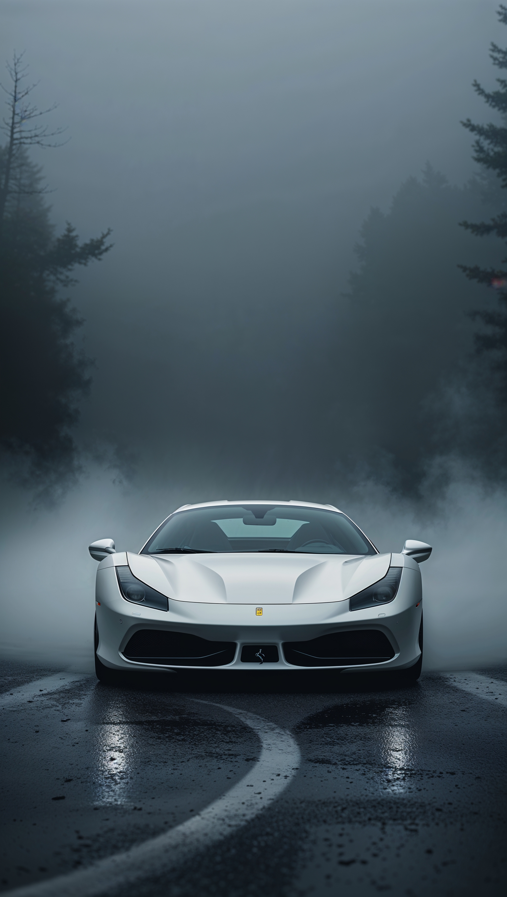 1664x2944 iPhone wallpaper with a white Ferrari on a dark, foggy background