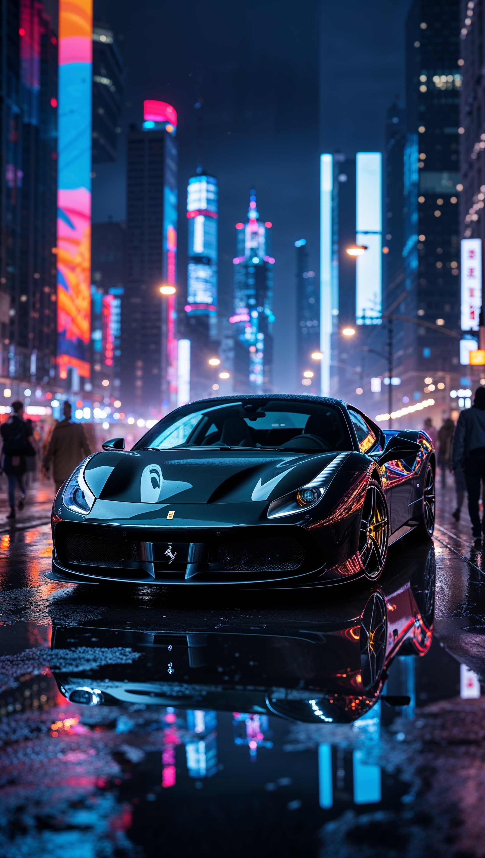 1664x2944 iPhone wallpaper featuring a shiny black Ferrari in a city night