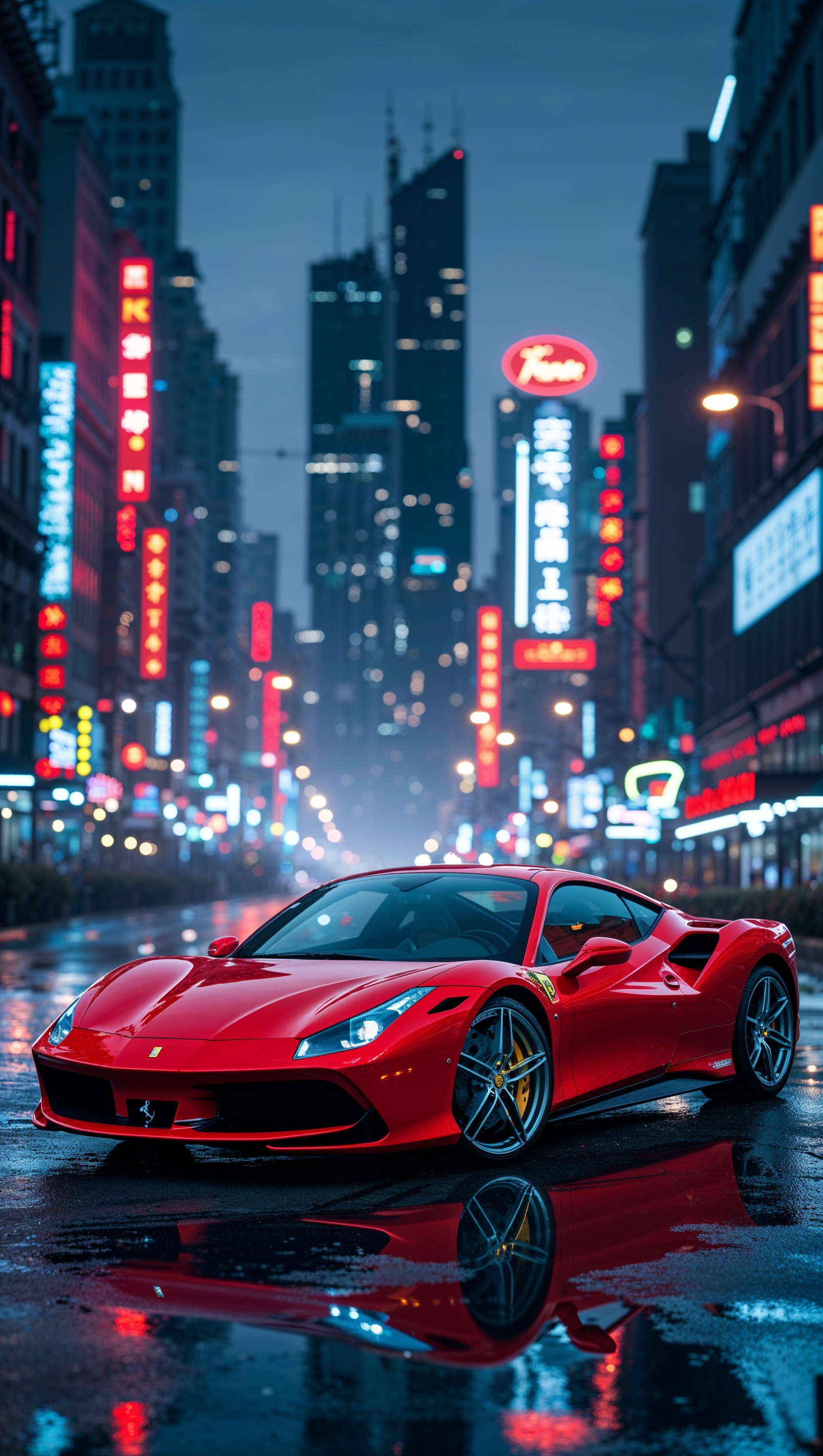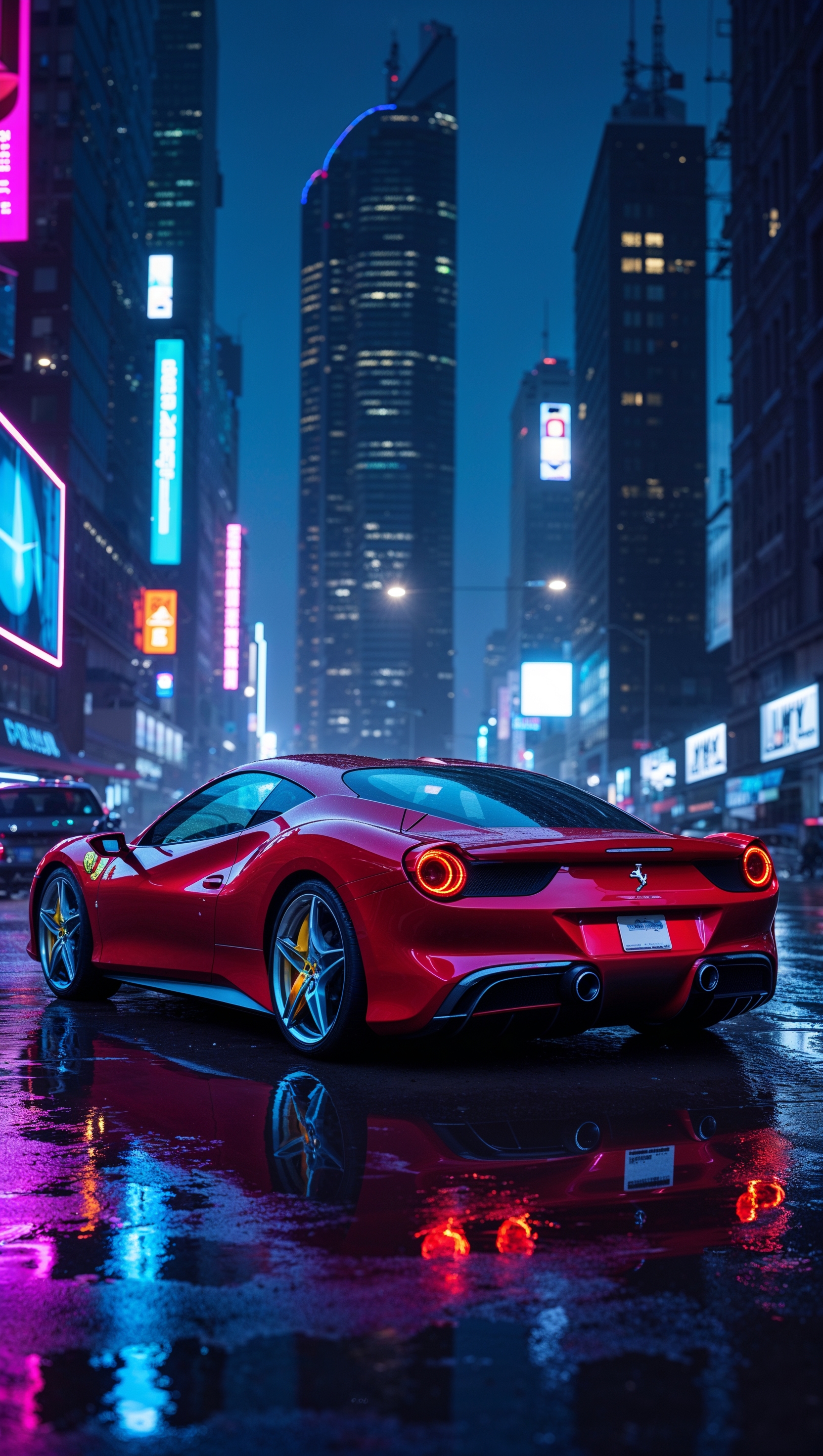 1664x2944 iPhone wallpaper with red Ferrari and neon glow at night