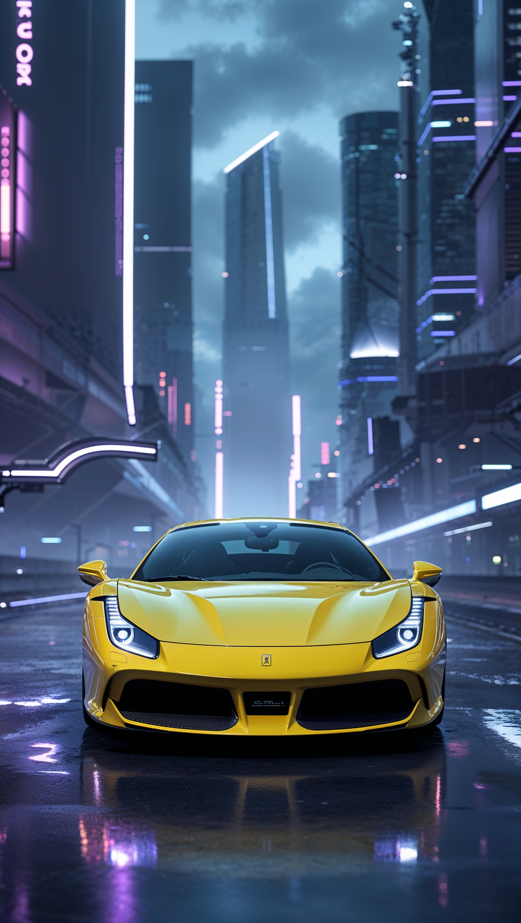1664x2944 iPhone wallpaper with a yellow Ferrari in a futuristic setting