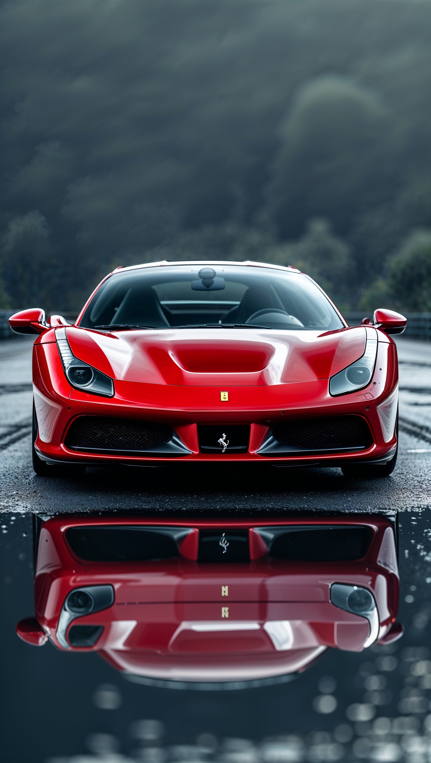 1664x2944 iPhone wallpaper with red Ferrari and water reflection on road