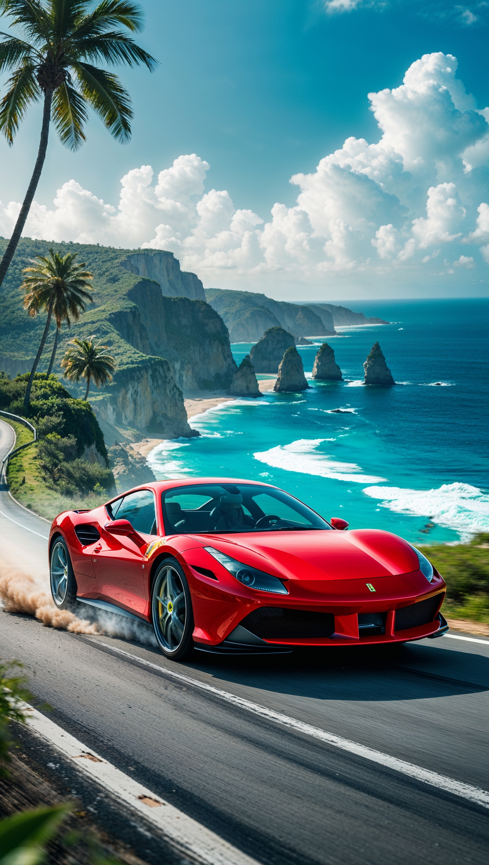 1664x2944 iPhone wallpaper with Ferrari driving on a beautiful coastal road