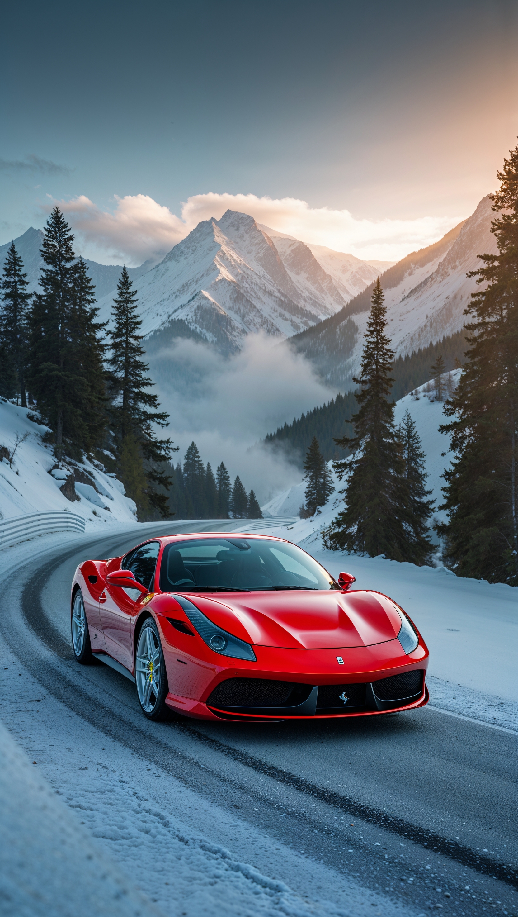 1664x2944 iPhone wallpaper with red sports Ferrari in snowy winter scene