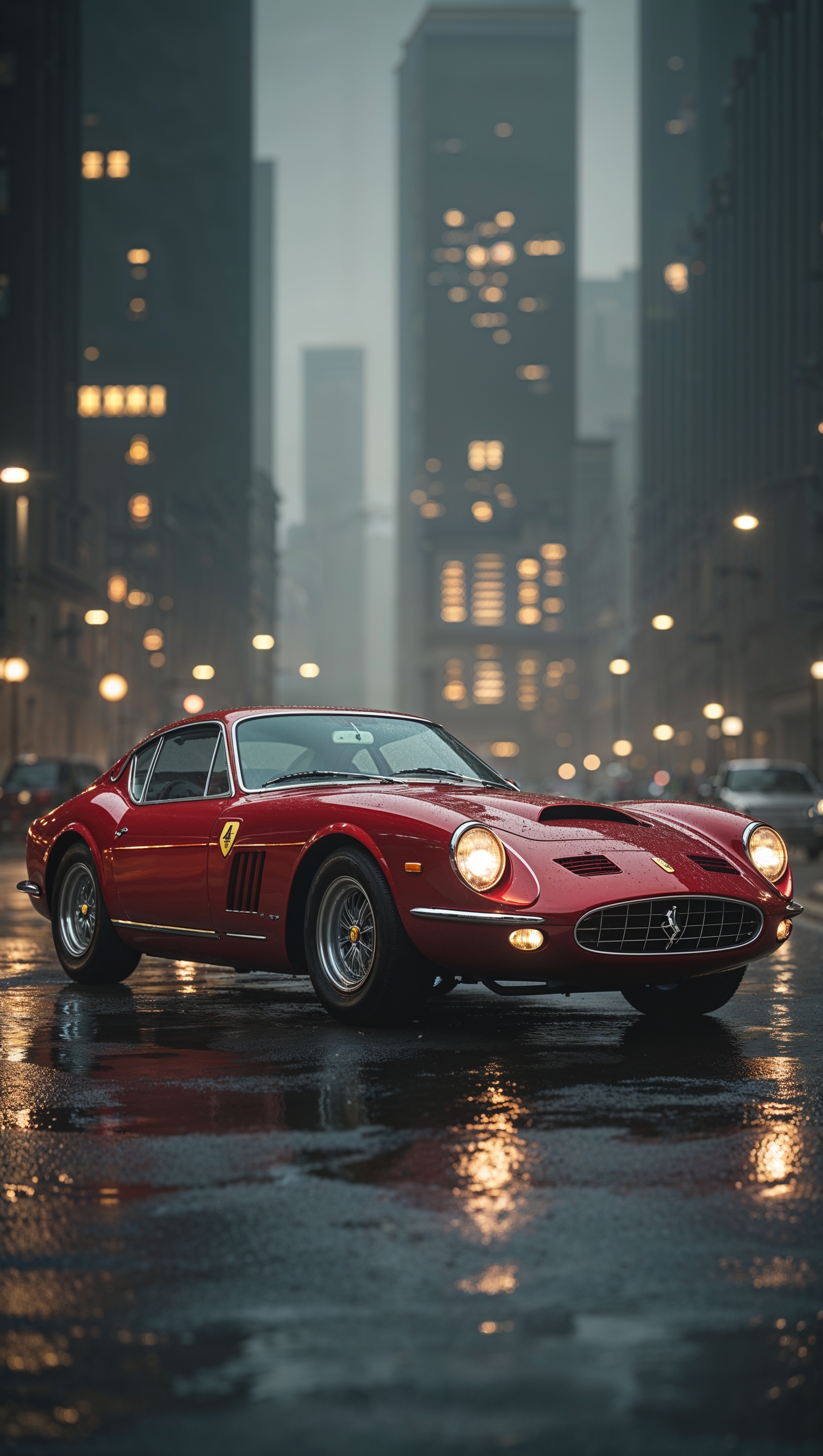 1664x2944 iPhone wallpaper with classic Ferrari on rainy streets