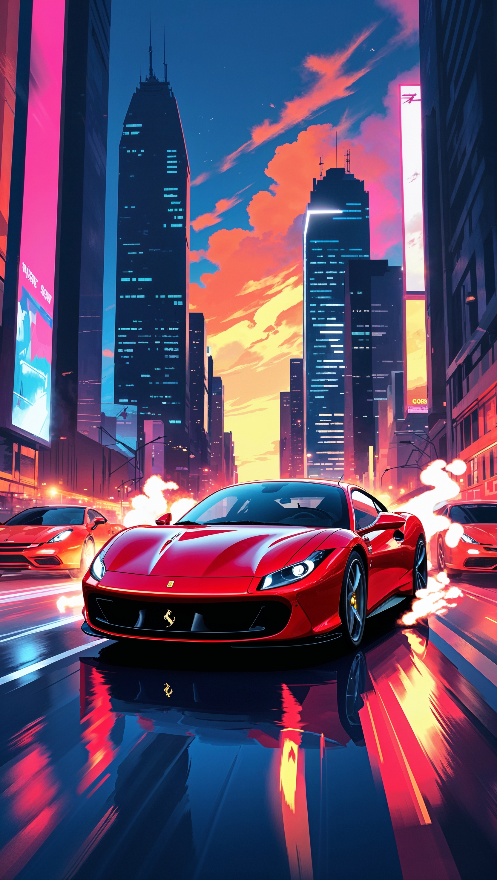 1664x2944 iPhone wallpaper with Ferrari at night with city lights