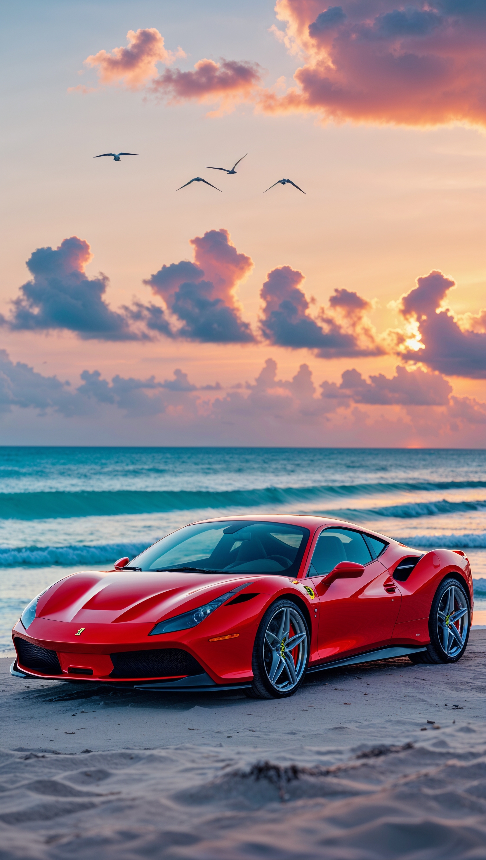 1664x2944 iPhone wallpaper with Ferrari at beach sunset scene