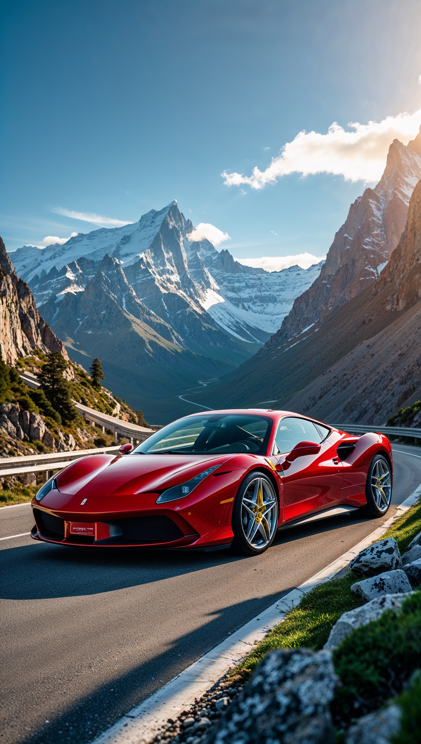 1664x2944 iPhone wallpaper with red Ferrari near tall mountains