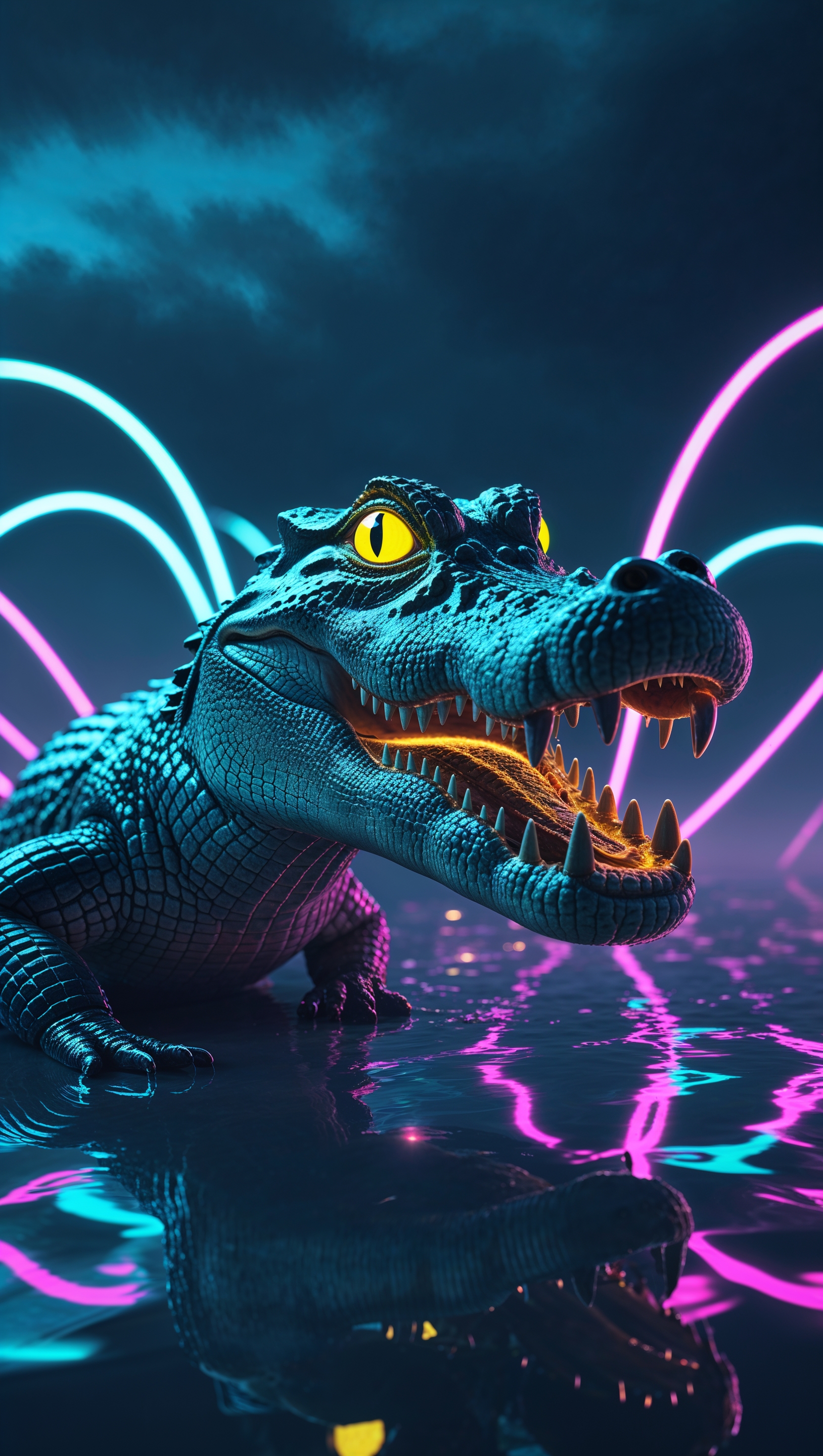 1664x2944 iPhone wallpaper with an alligator at night and neon lights