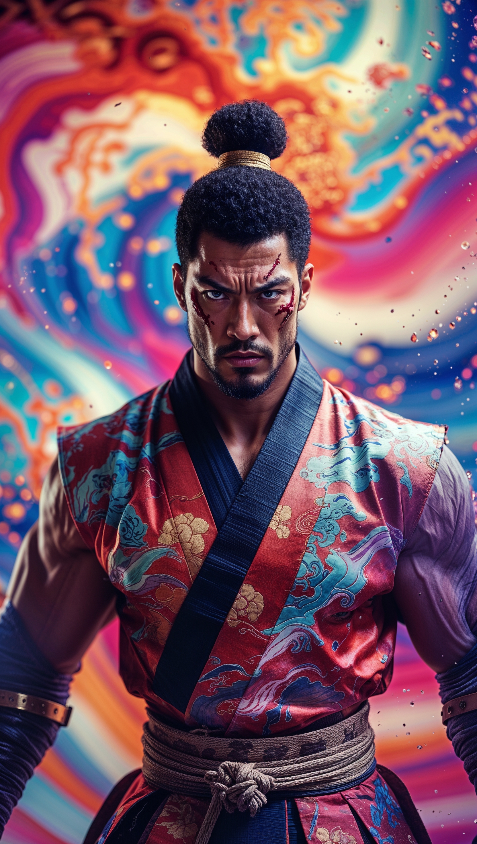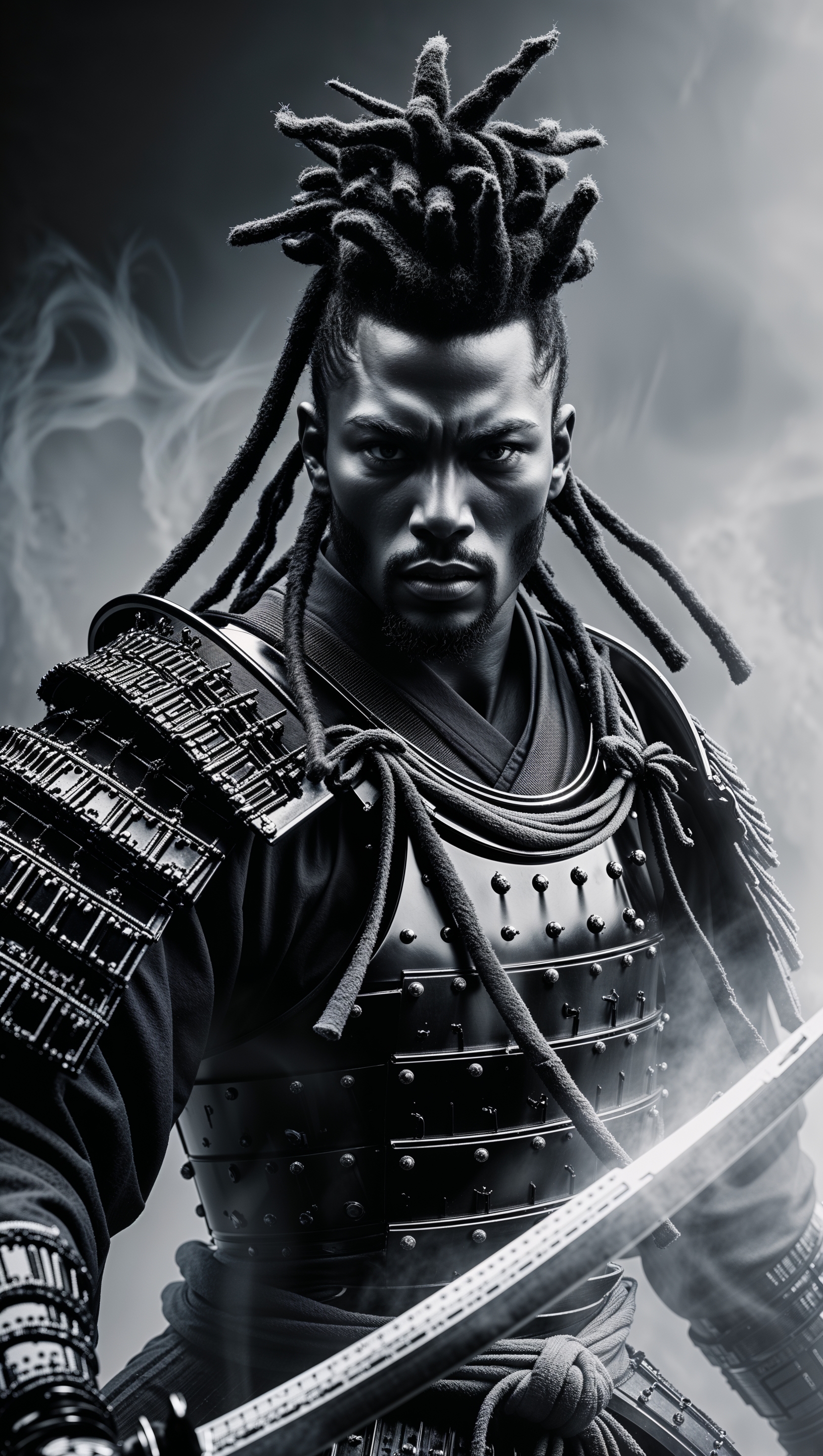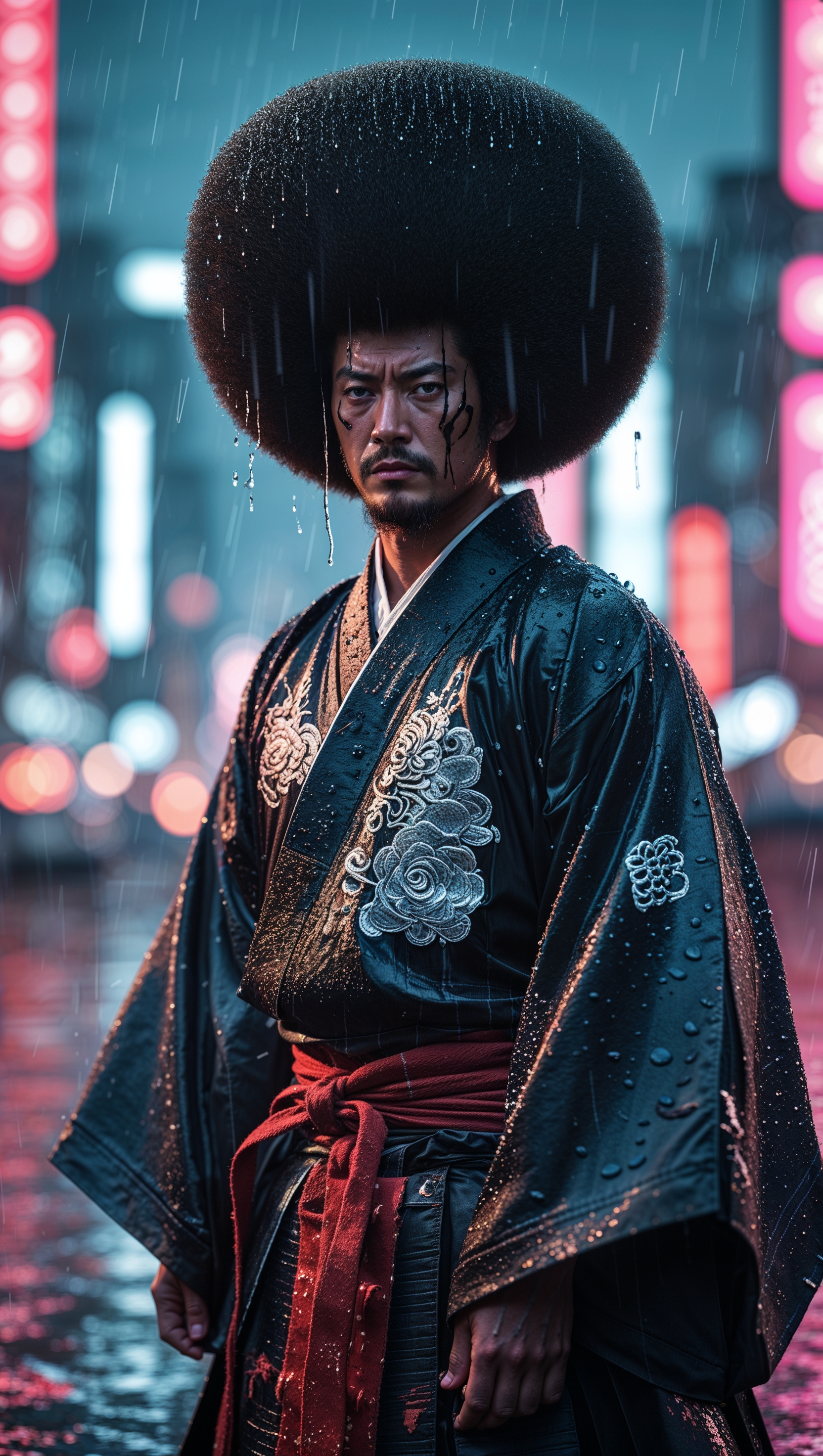 1664x2944 Samurai warrior with afro hair, wearing a black kimono, standing in the rain, iPhone background