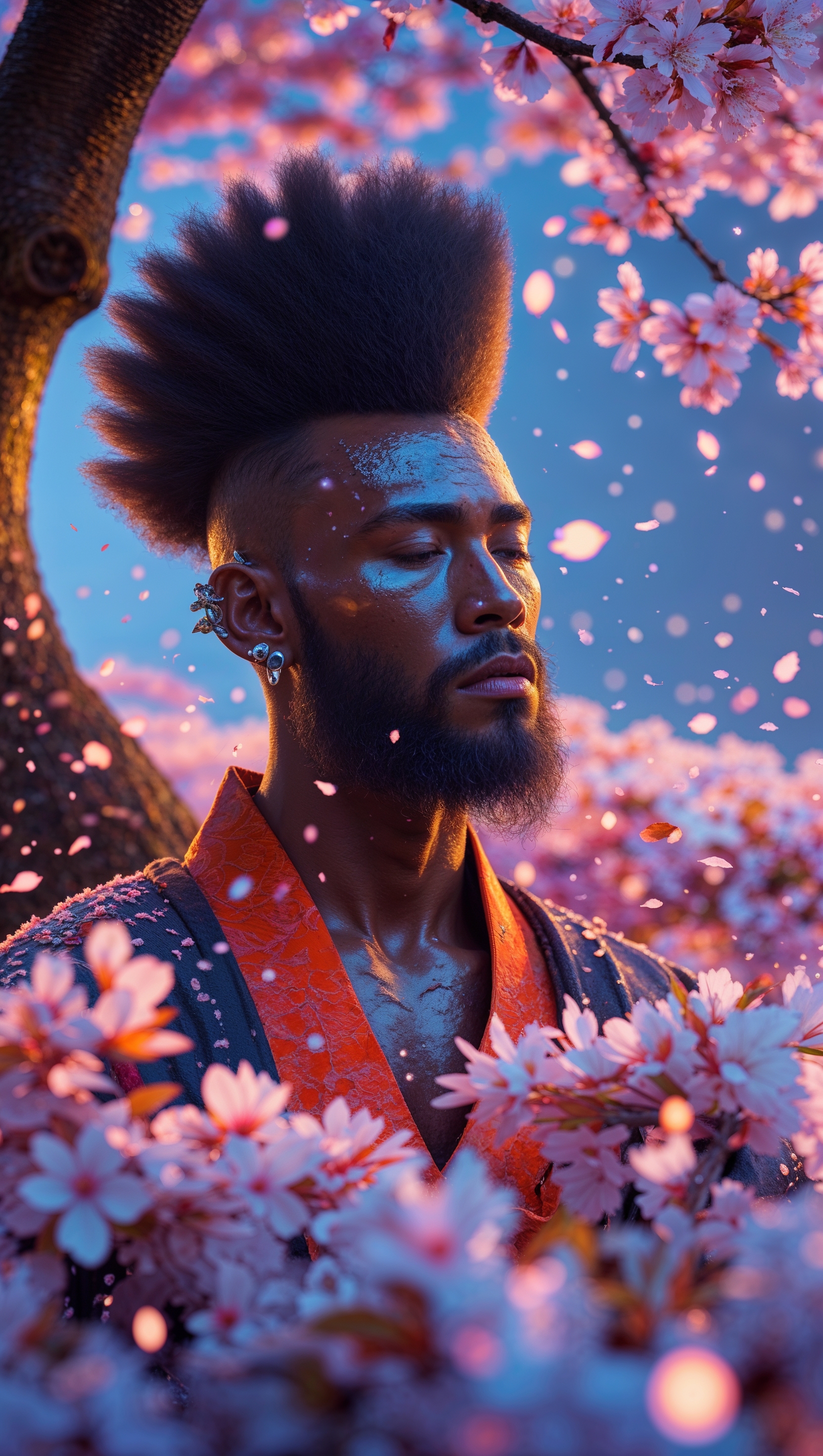 1664x2944 Afro Samurai meditating under a cherry blossom tree, petals falling around, iPhone wallpaper
