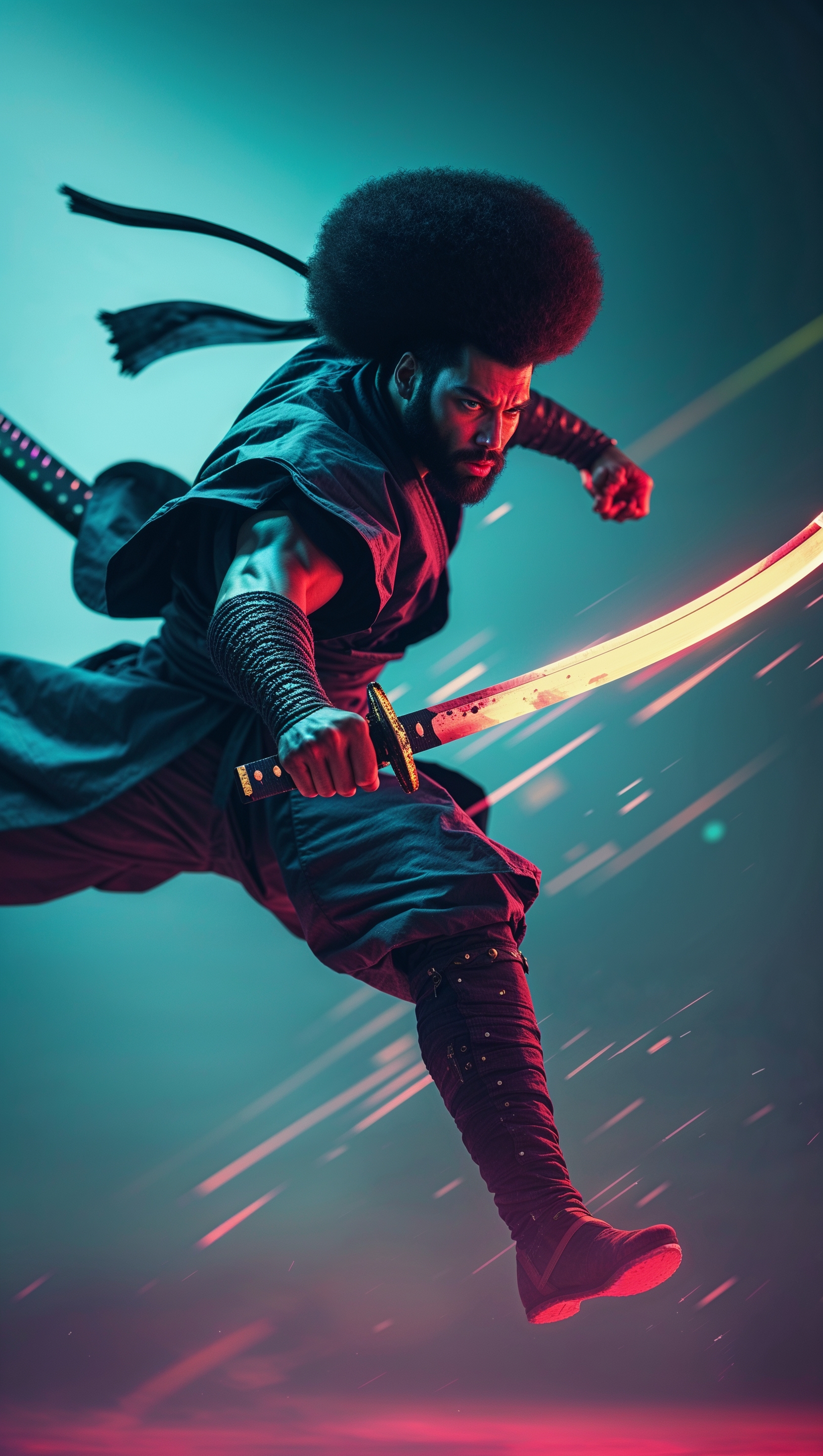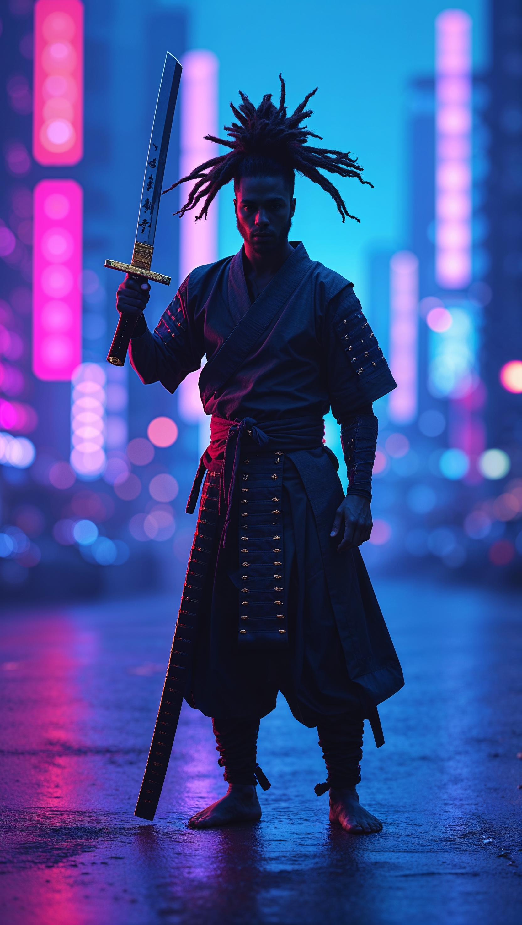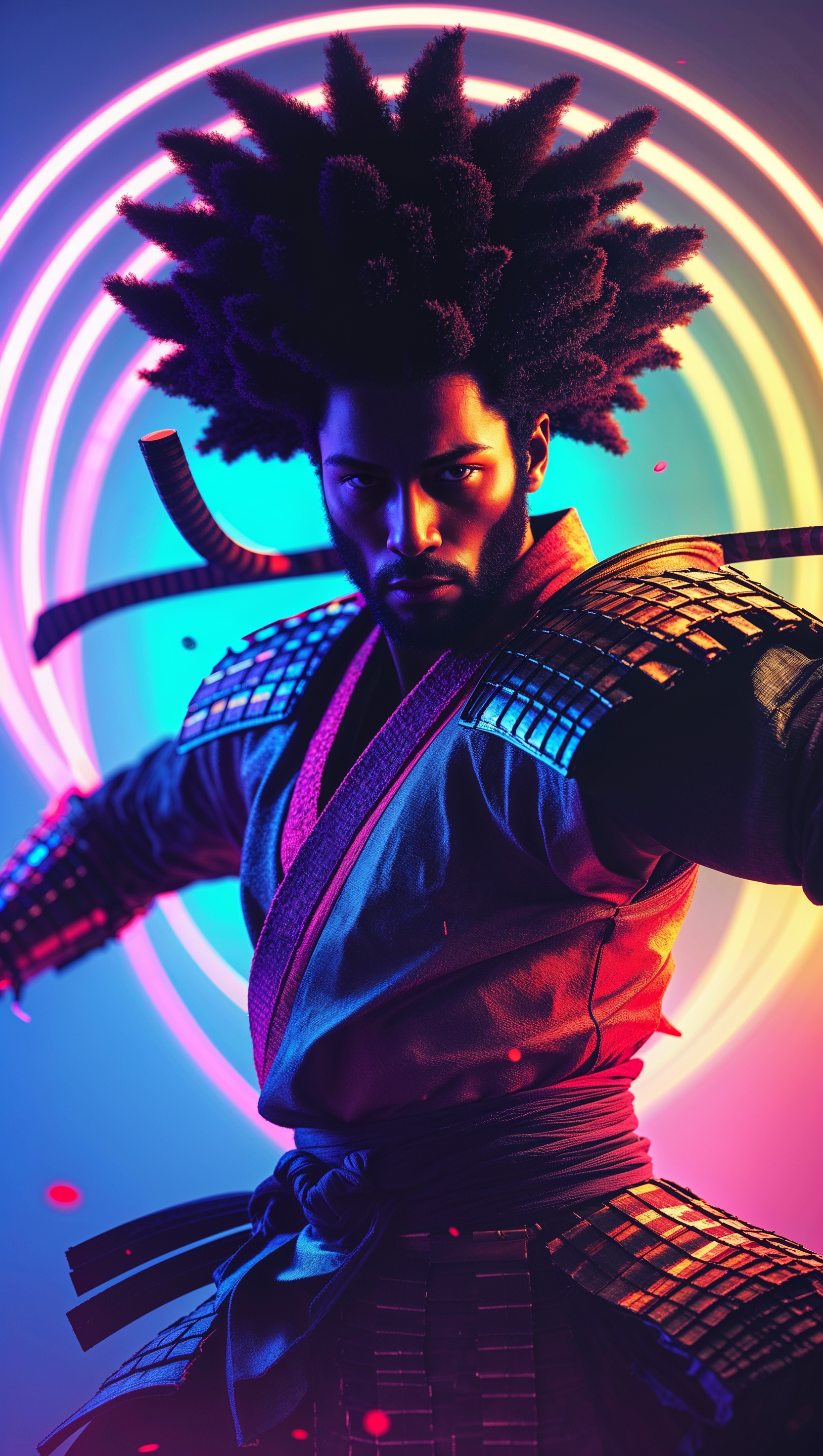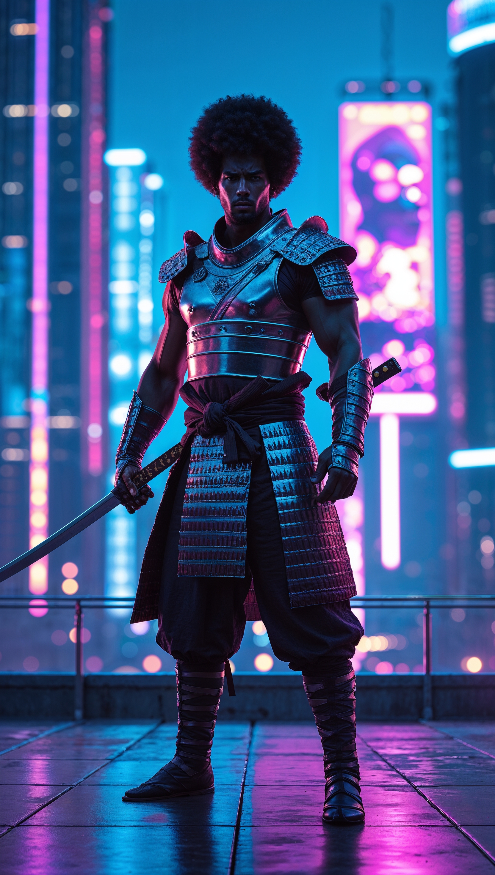 1664x2944 Afro Samurai standing on a futuristic rooftop, neon lights glowing around him, iPhone wallpaper style