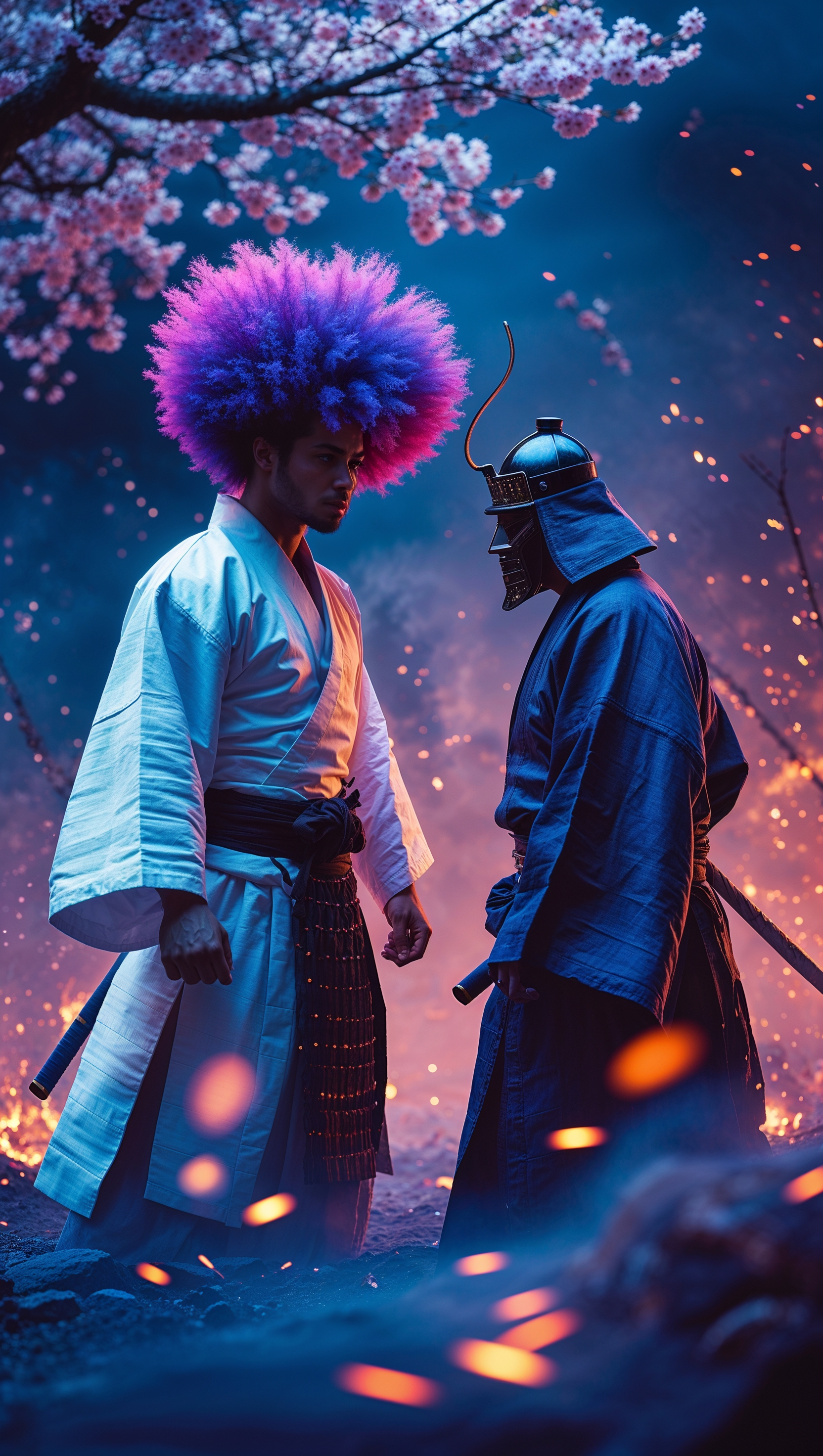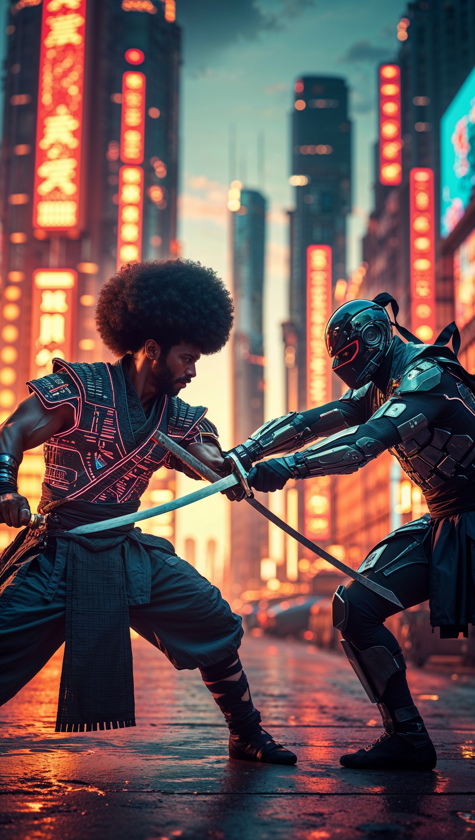 1664x2944 Epic battle scene featuring Afro Samurai versus a cyber ninja, high-resolution iPhone wallpaper