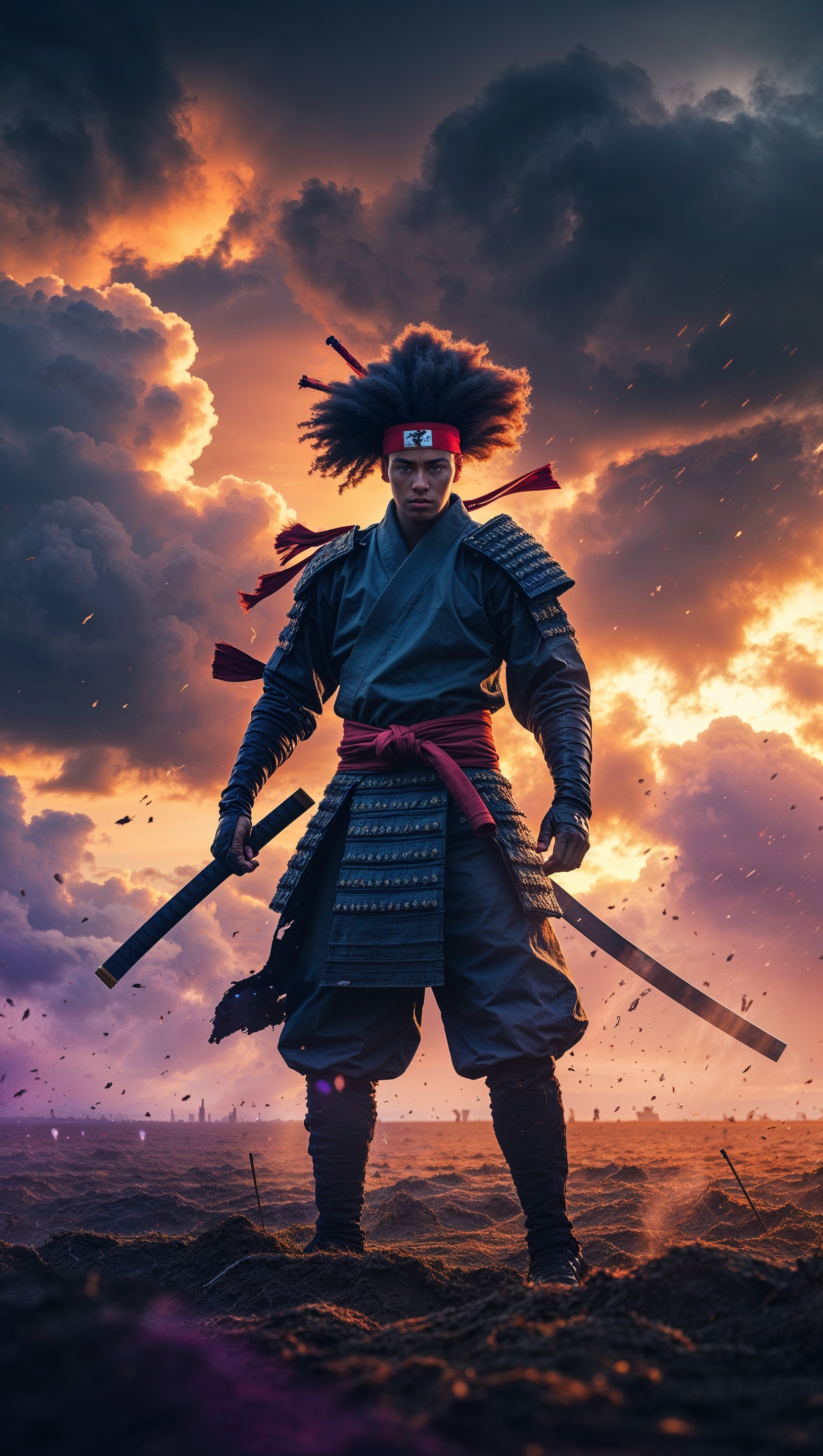1664x2944 Afro Samurai against a backdrop of fiery sunset, intense red and orange hues, iPhone wallpaper