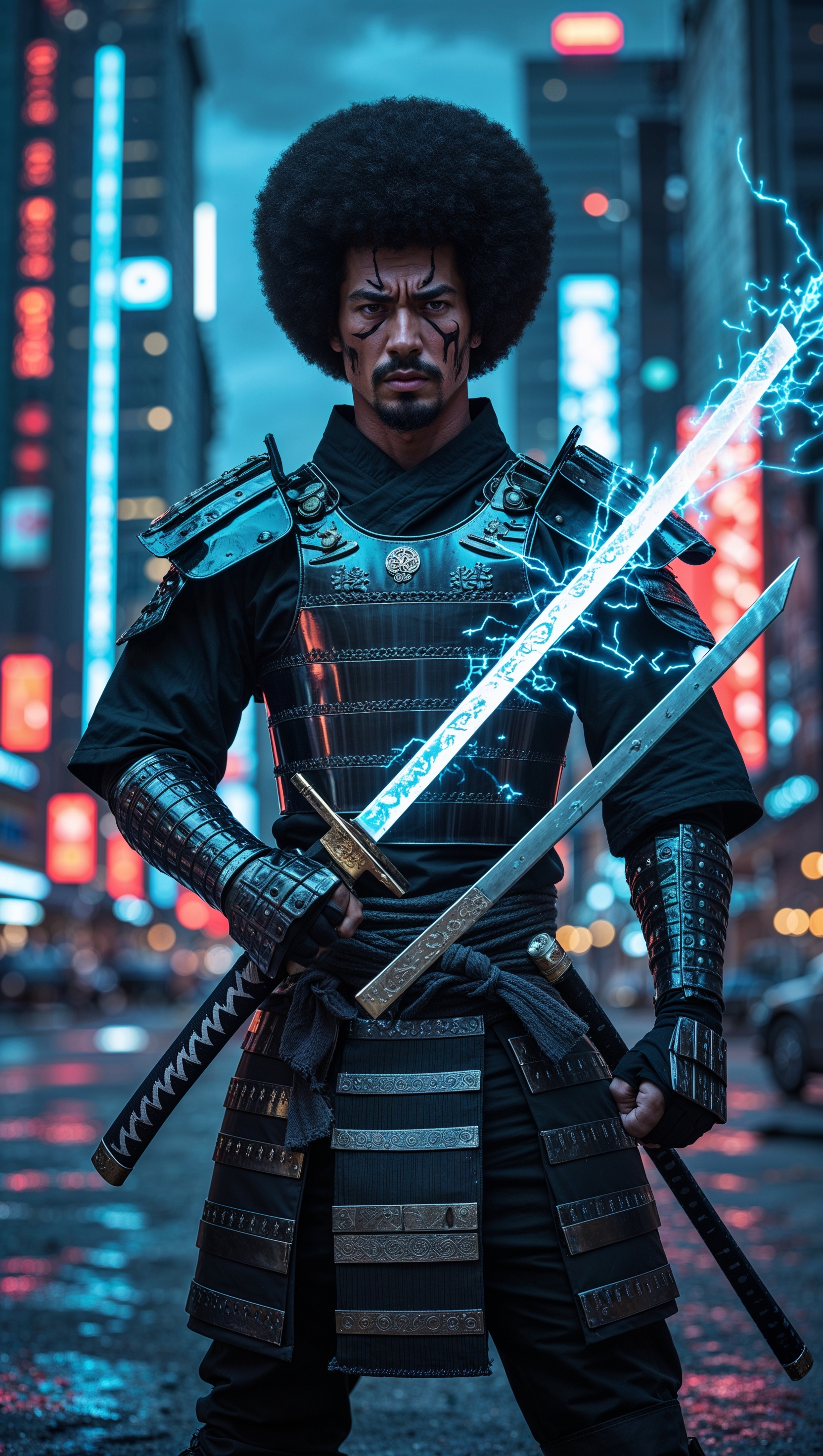 1664x2944 Afro Samurai in a cyberpunk city, holding a katana with electric sparks, iPhone wallpaper aesthetic