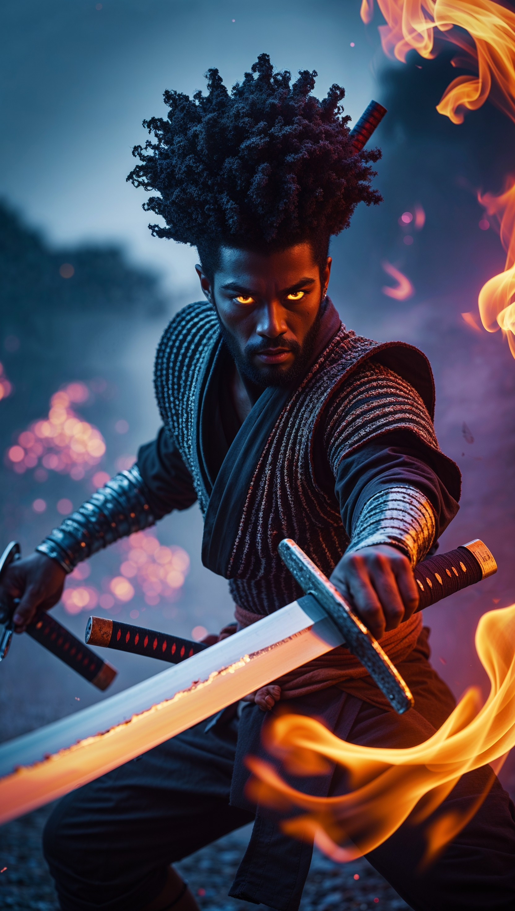 1664x2944 Afro Samurai surrounded by flames, wielding two swords, dark and moody iPhone wallpaper