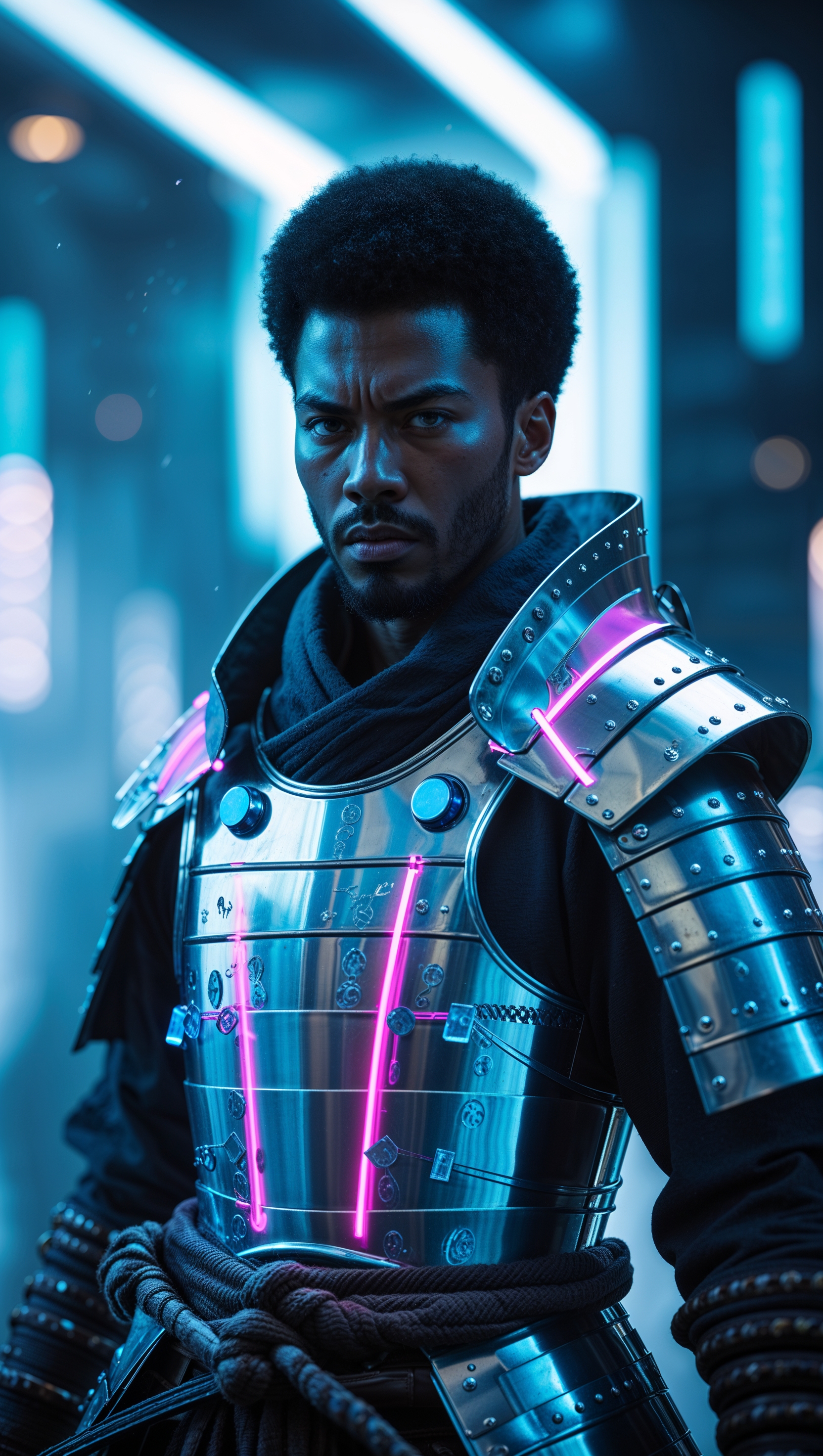 1664x2944 Afro Samurai with futuristic armor, neon blue highlights, high-tech iPhone wallpaper
