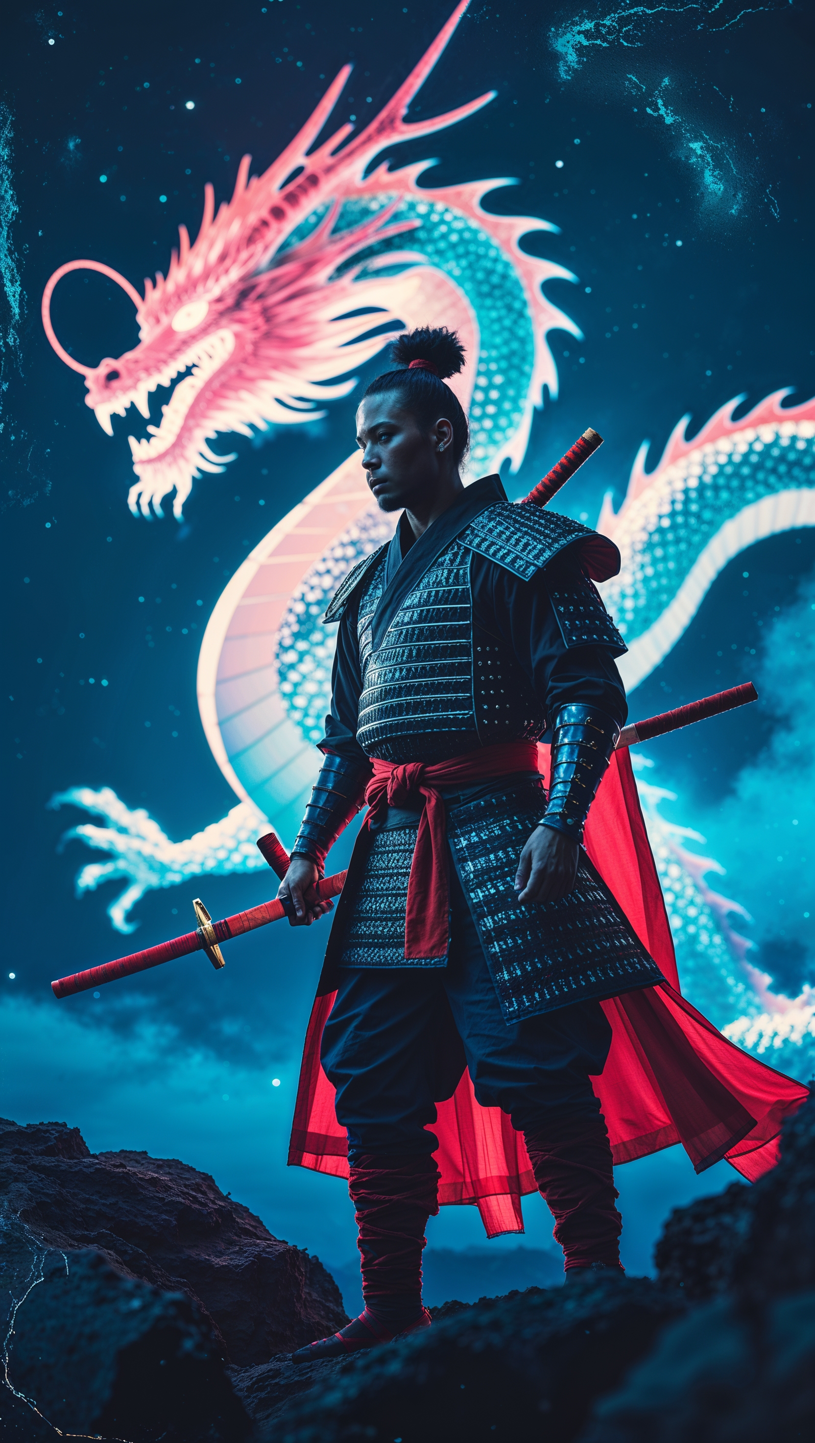 1664x2944 Afro Samurai with a dragon spirit behind him, glowing in the night, iPhone fantasy wallpaper