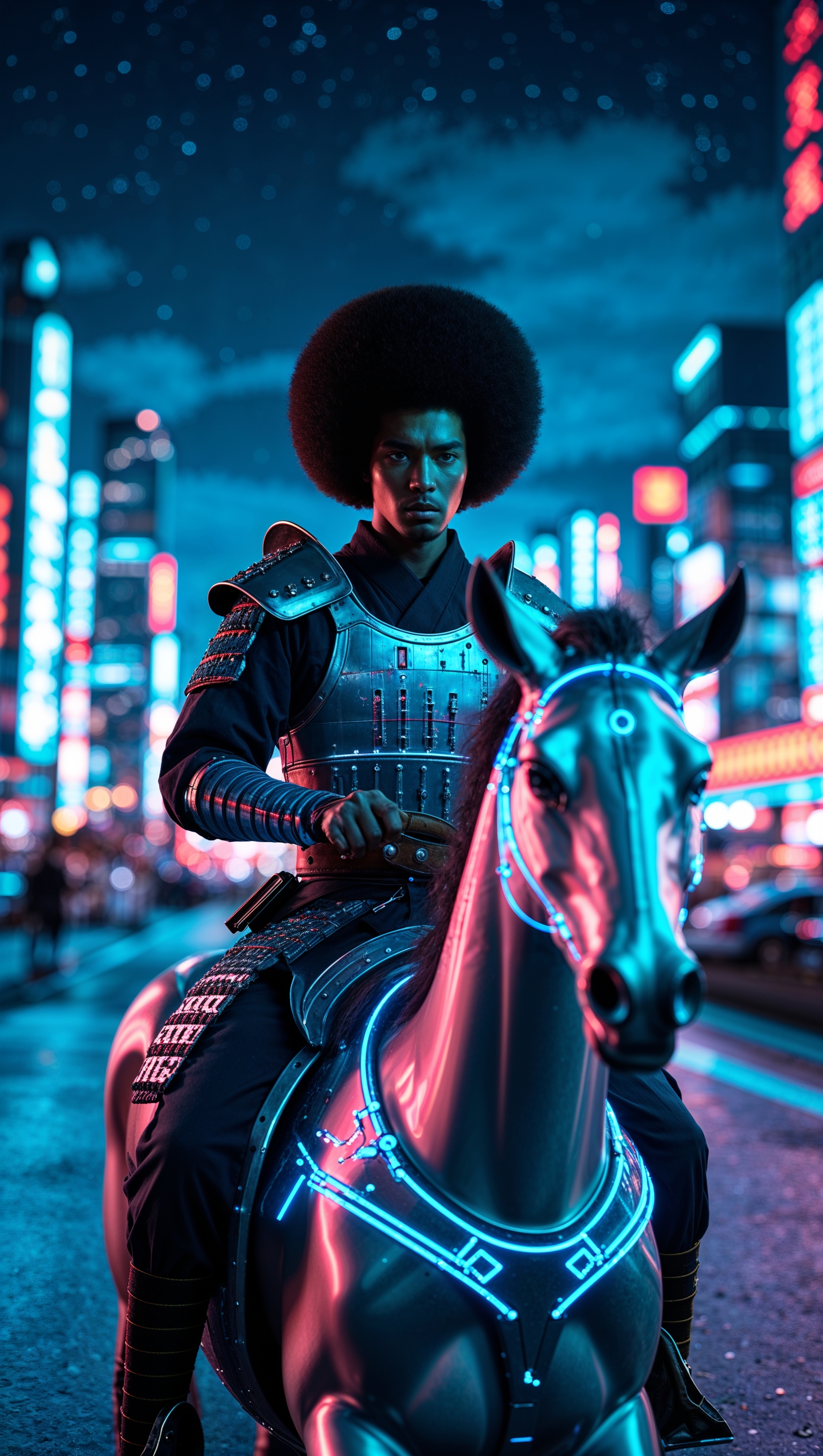 1664x2944 Afro Samurai riding a cybernetic horse, sci-fi samurai theme, iPhone wallpaper