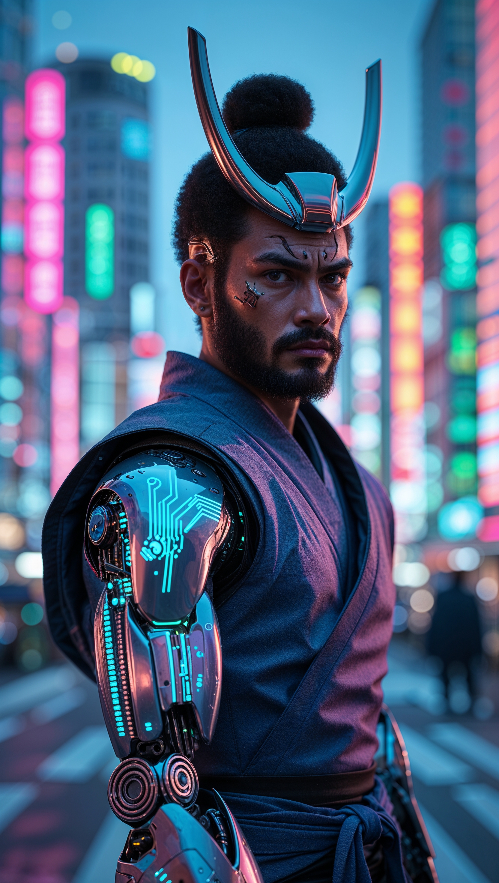 1664x2944 Futuristic Afro Samurai with robotic arm, neon Tokyo skyline in the background, iPhone wallpaper