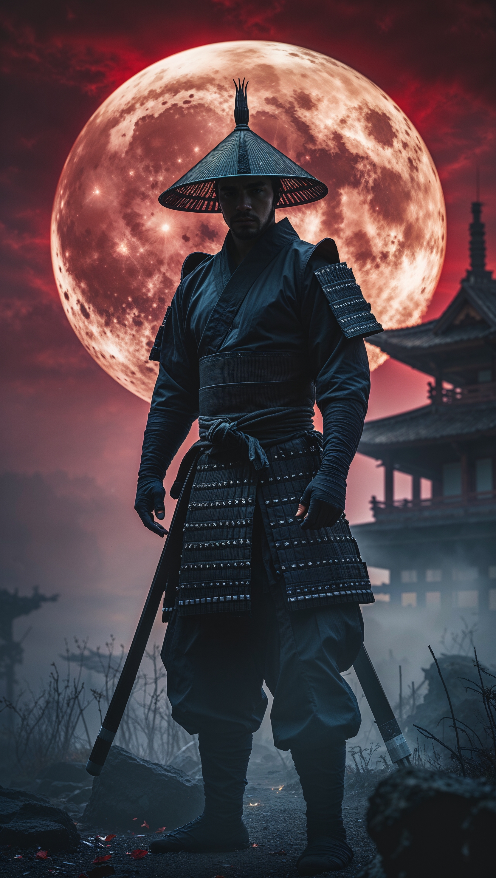 1664x2944 Afro Samurai’s silhouette against a blood moon, dark samurai aesthetic, iPhone wallpaper