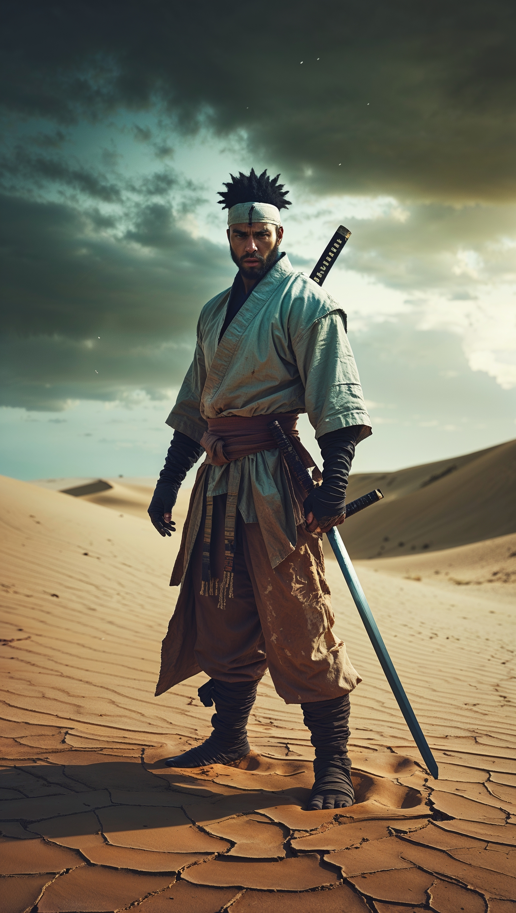 1664x2944 Afro Samurai in a desert wasteland, lone warrior aesthetic, iPhone wallpaper