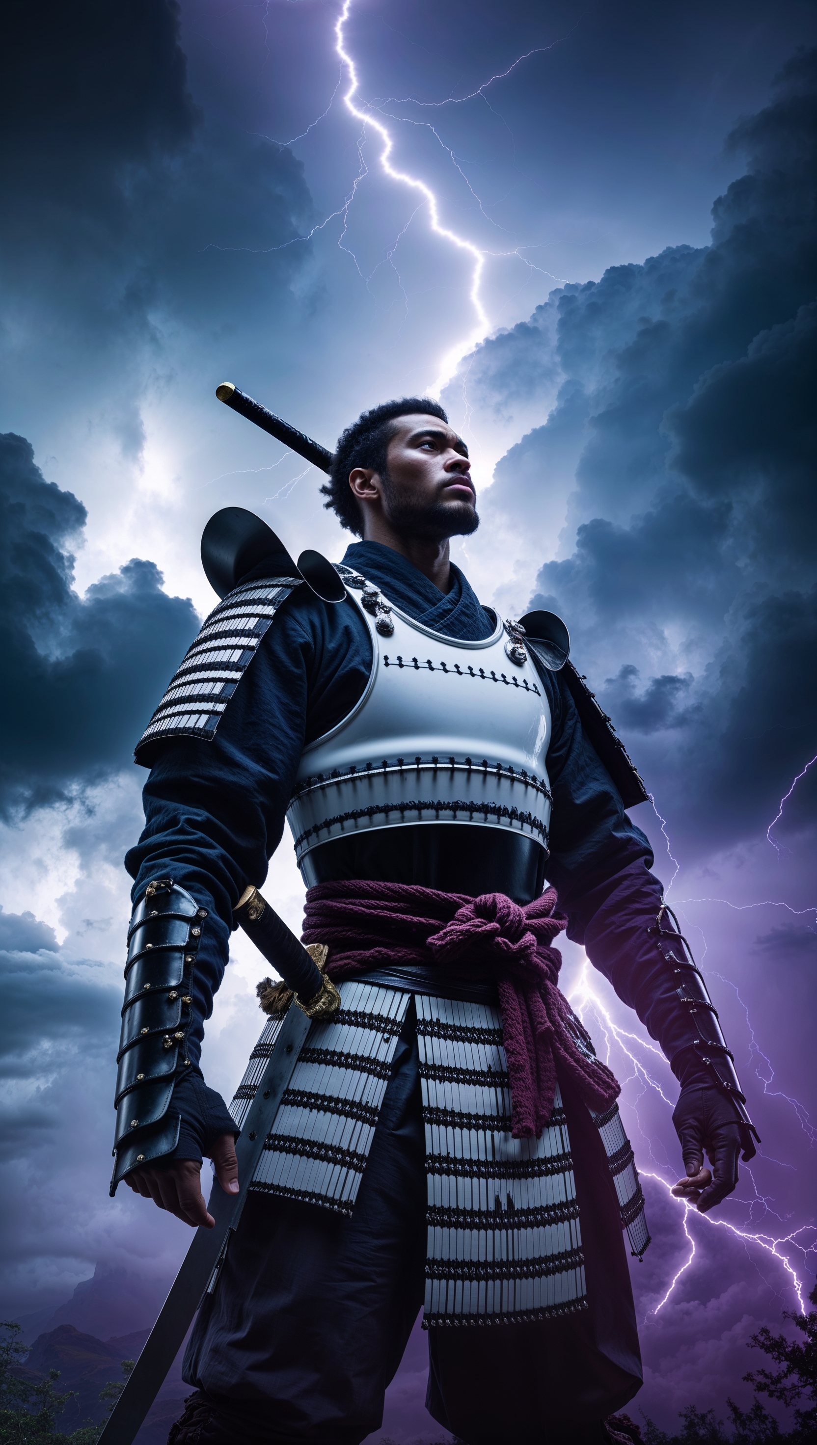 1664x2944 Afro Samurai with storm clouds behind him, lightning striking his sword, dramatic iPhone wallpaper