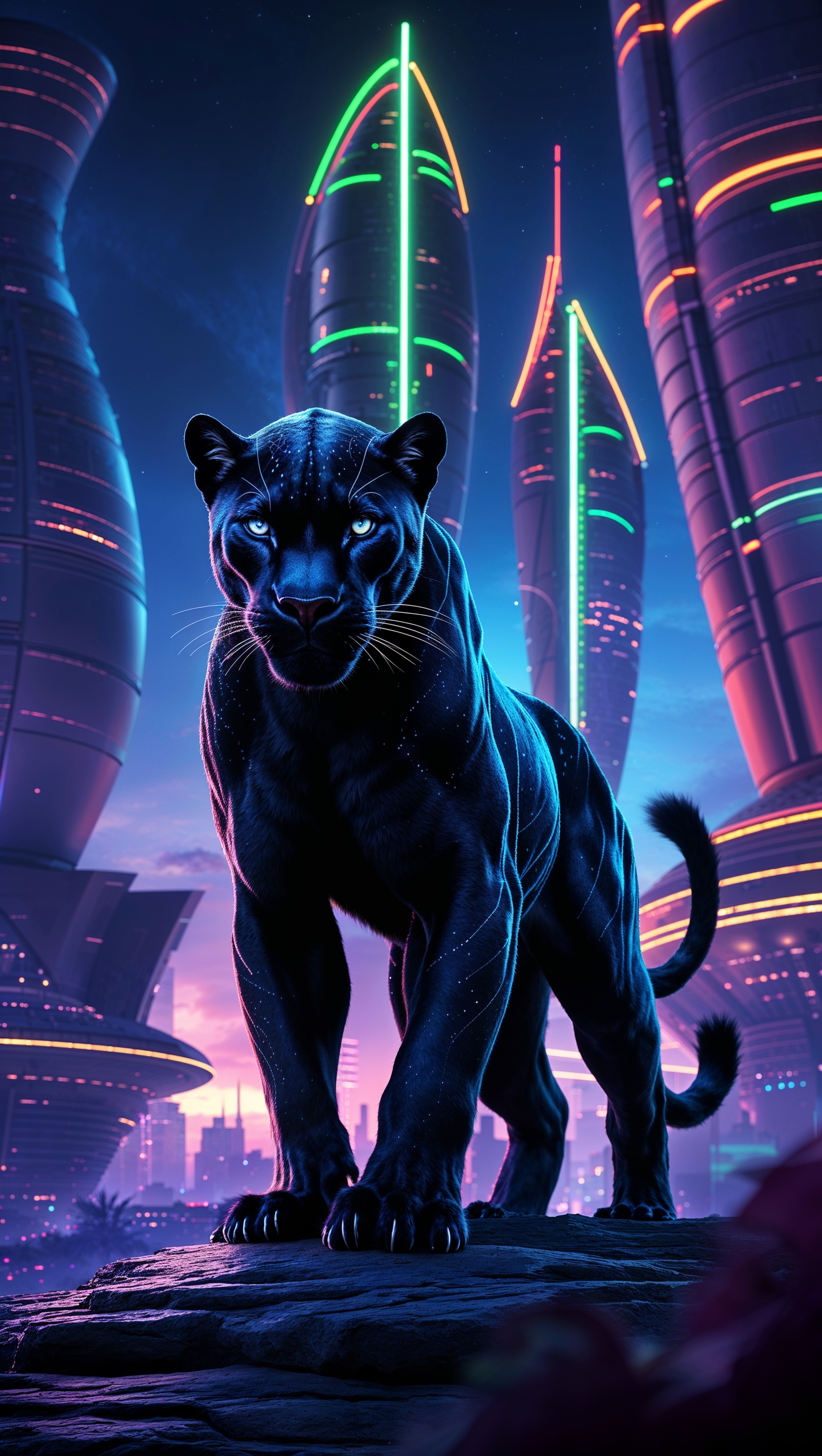 1664x2944 Cyberpunk Black Panther with neon cityscape, high contrast iPhone wallpaper