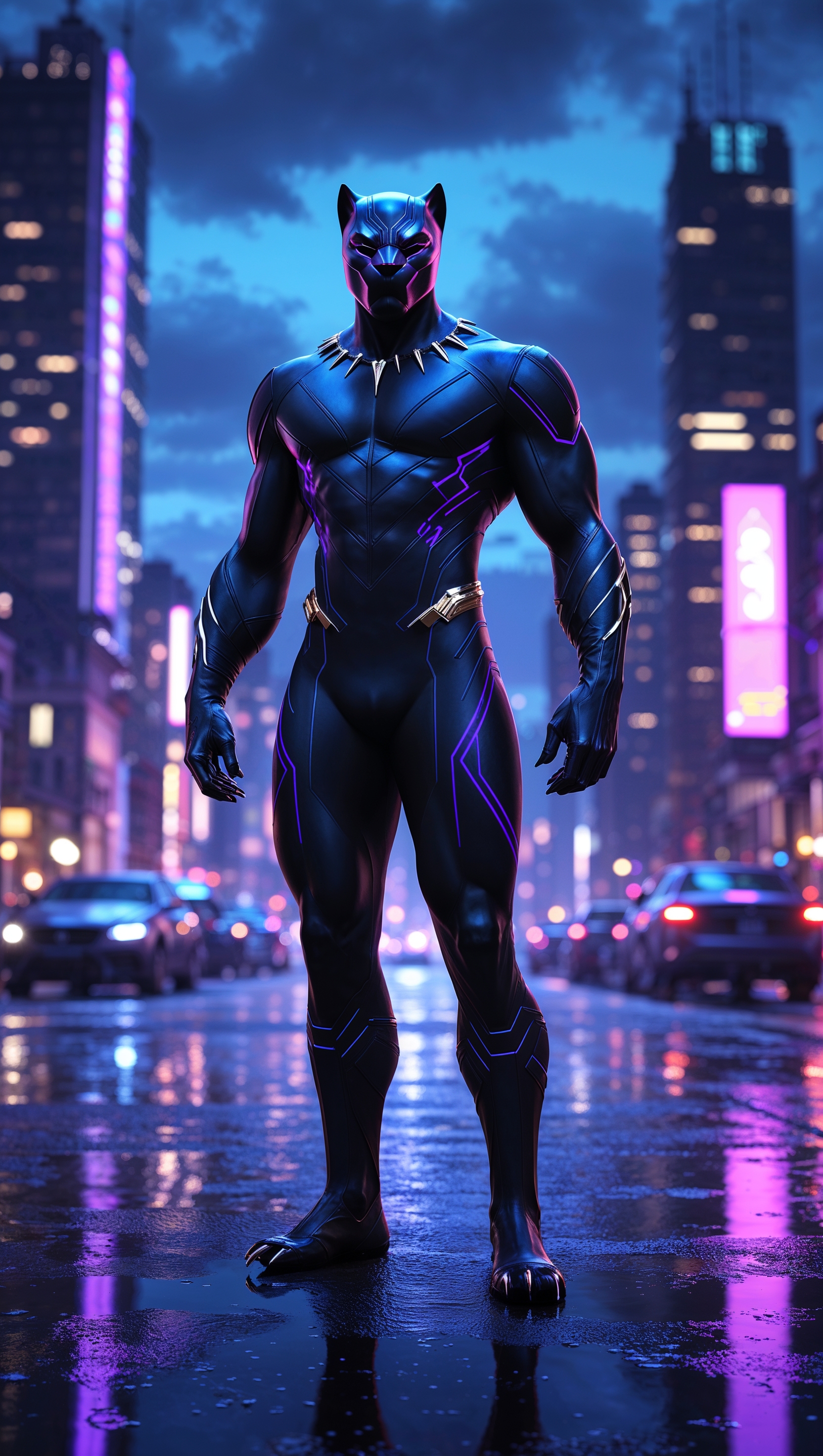 1664x2944 Black Panther in Wakanda city at night, glowing lights, futuristic look, iPhone wallpaper